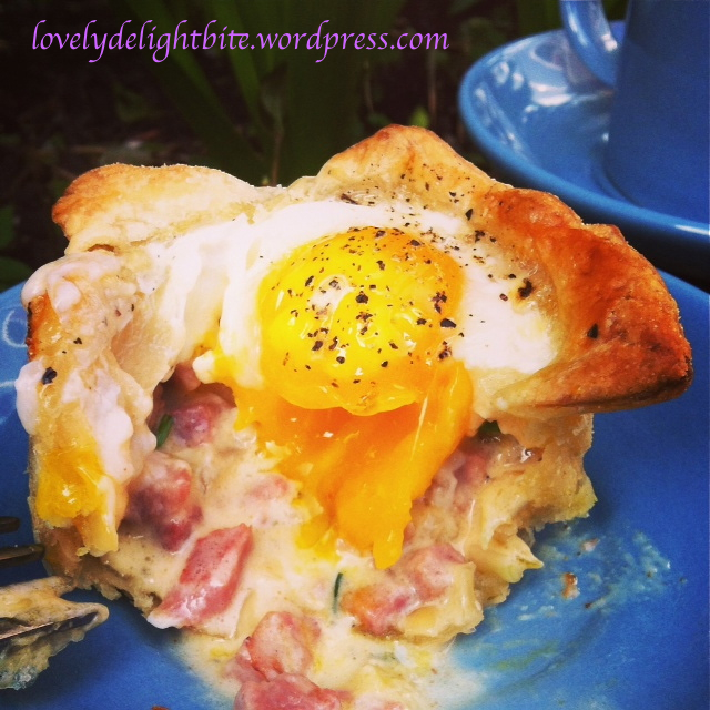 This morning spring was in front of the door and I decided to jazz up our brunch with yummie Breakfast Baskets, with Ham, Egg, Onion, Cheese, Creme fraiche and Chives. A lovely dish for a brunch. Looks cute, tastes good and can be prepared a few hours in advanced, before you bake them.
