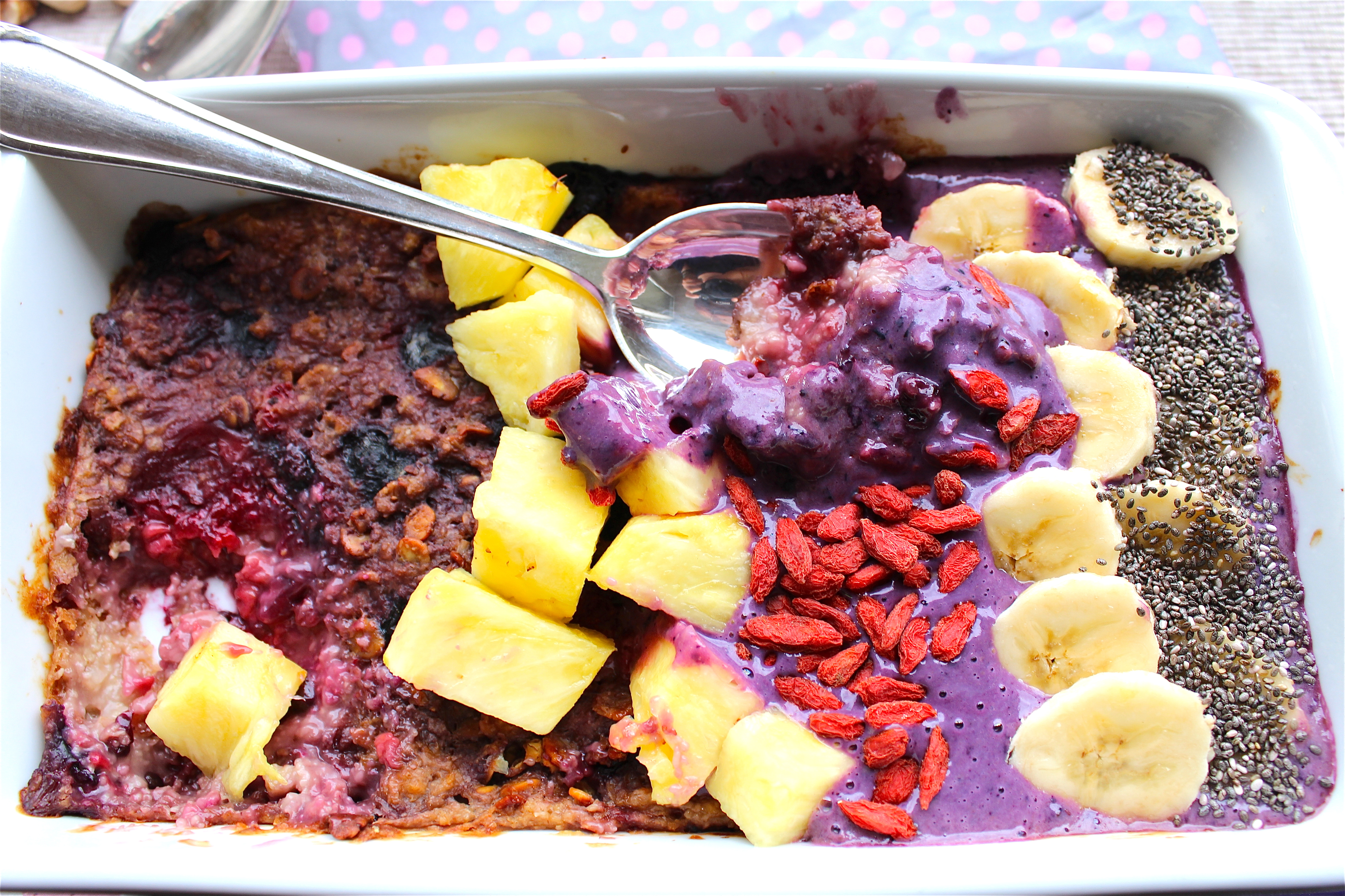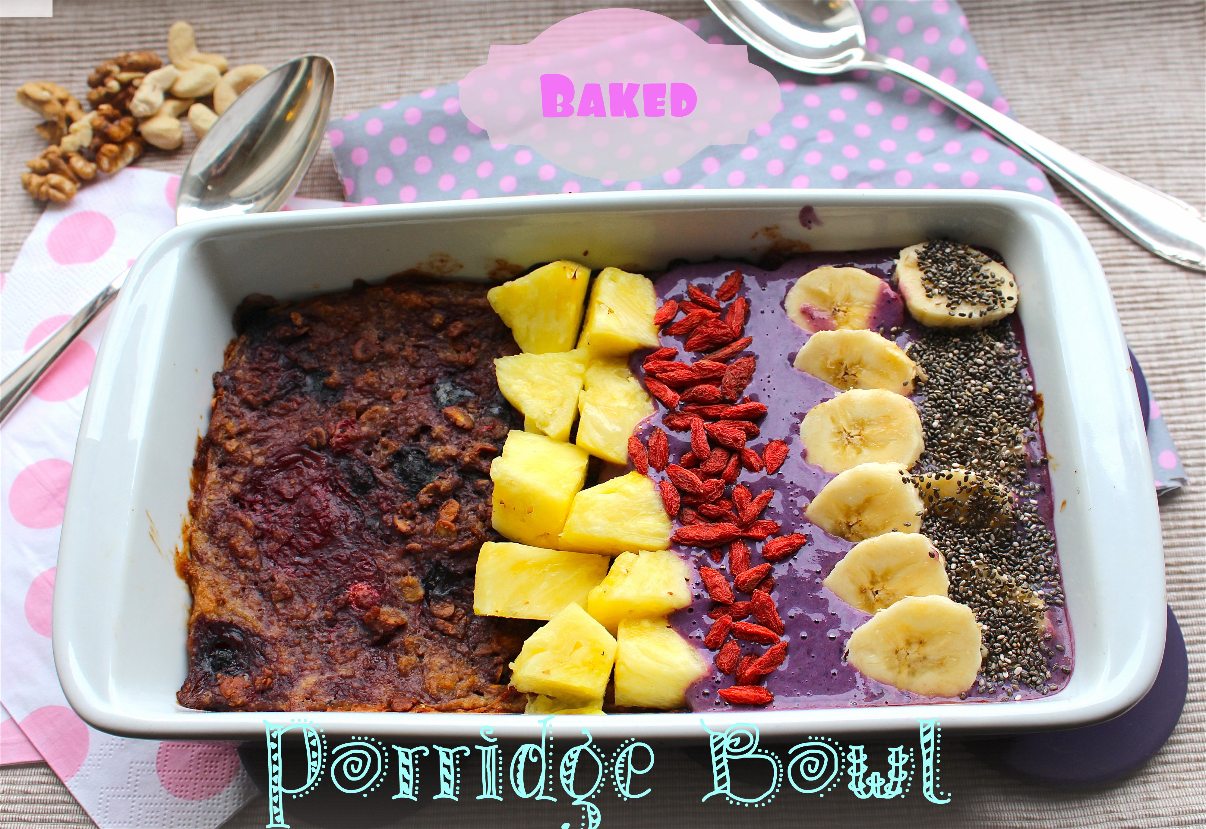 I changed it a bit, by baking my oats. What I like about this dish is, that you can use the fruits and nuts you like or have at home and create your very own perfect Baked Porridge Bowl.