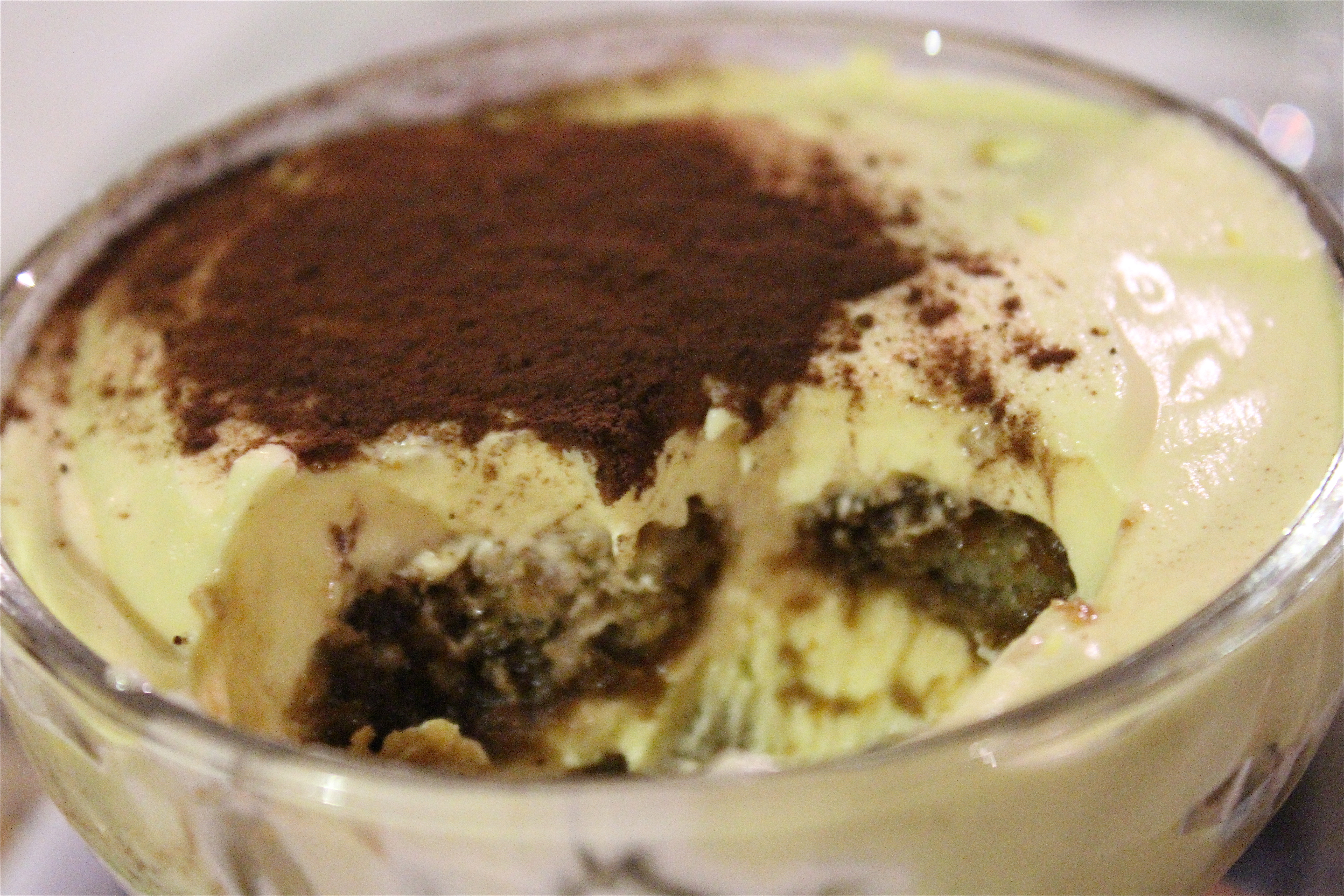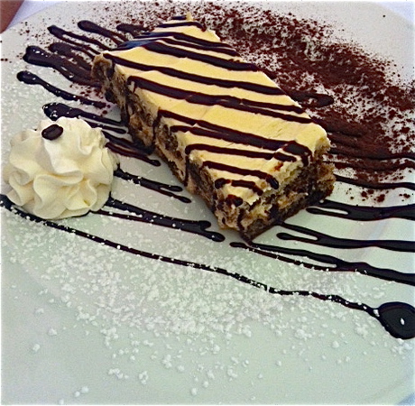 Tiramisu (means “pull me up”) is made of alternating layers of biscuits and mascarpone, egg yolks and egg whites. The biscuits are sprinkled with cold espresso, which is flavored with Marsala, Amaretto or brandy. The dessert is cooled for several hours, so that it becomes solid. Before serving, the final layer of cream is dusted with cocoa powder. Most restaurants make their own homemade Tiramisu, served as a piece or in a glass.