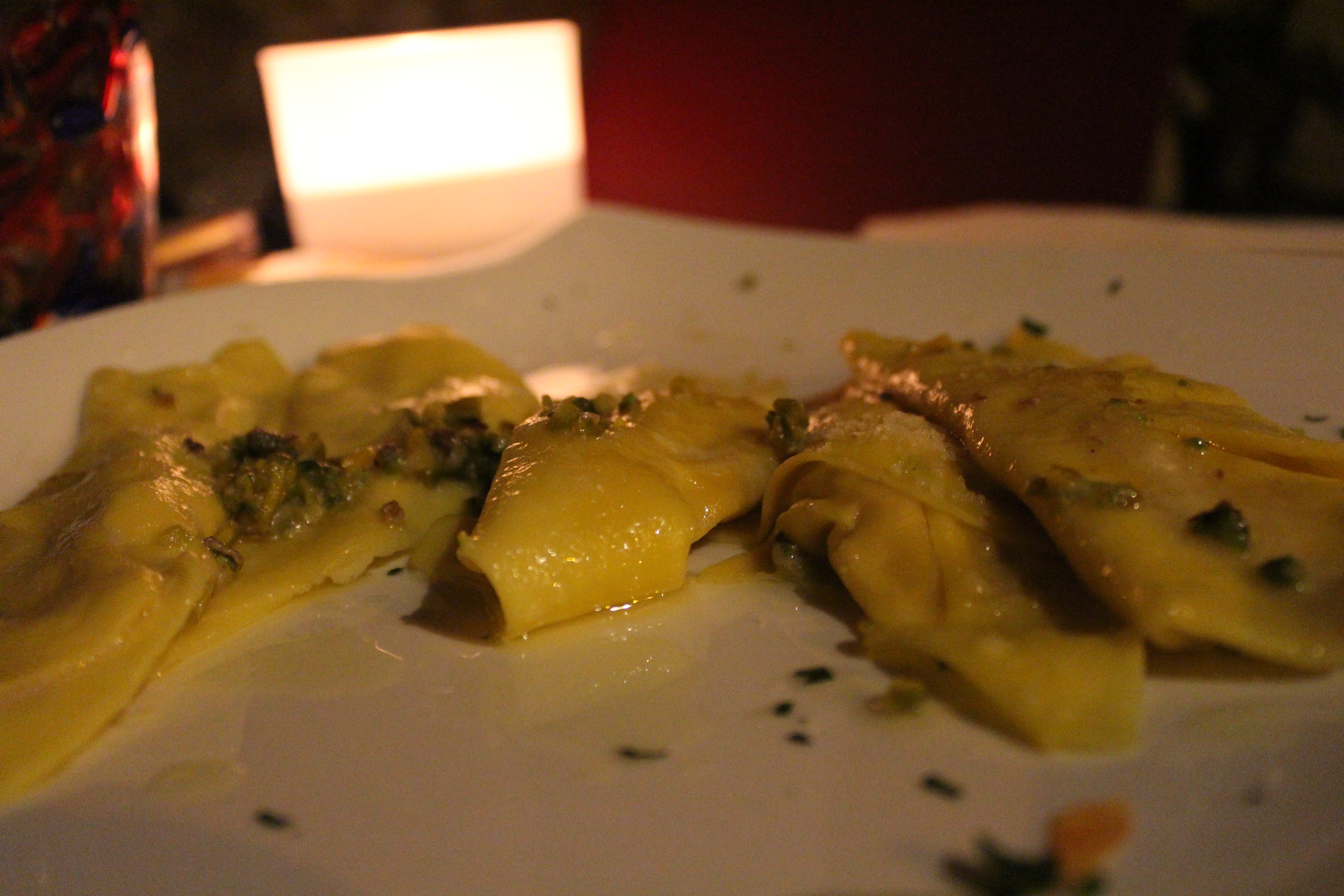 delicious example: Amarone egg pasta parcels with herb-infused cooked ham and crescenza cheese