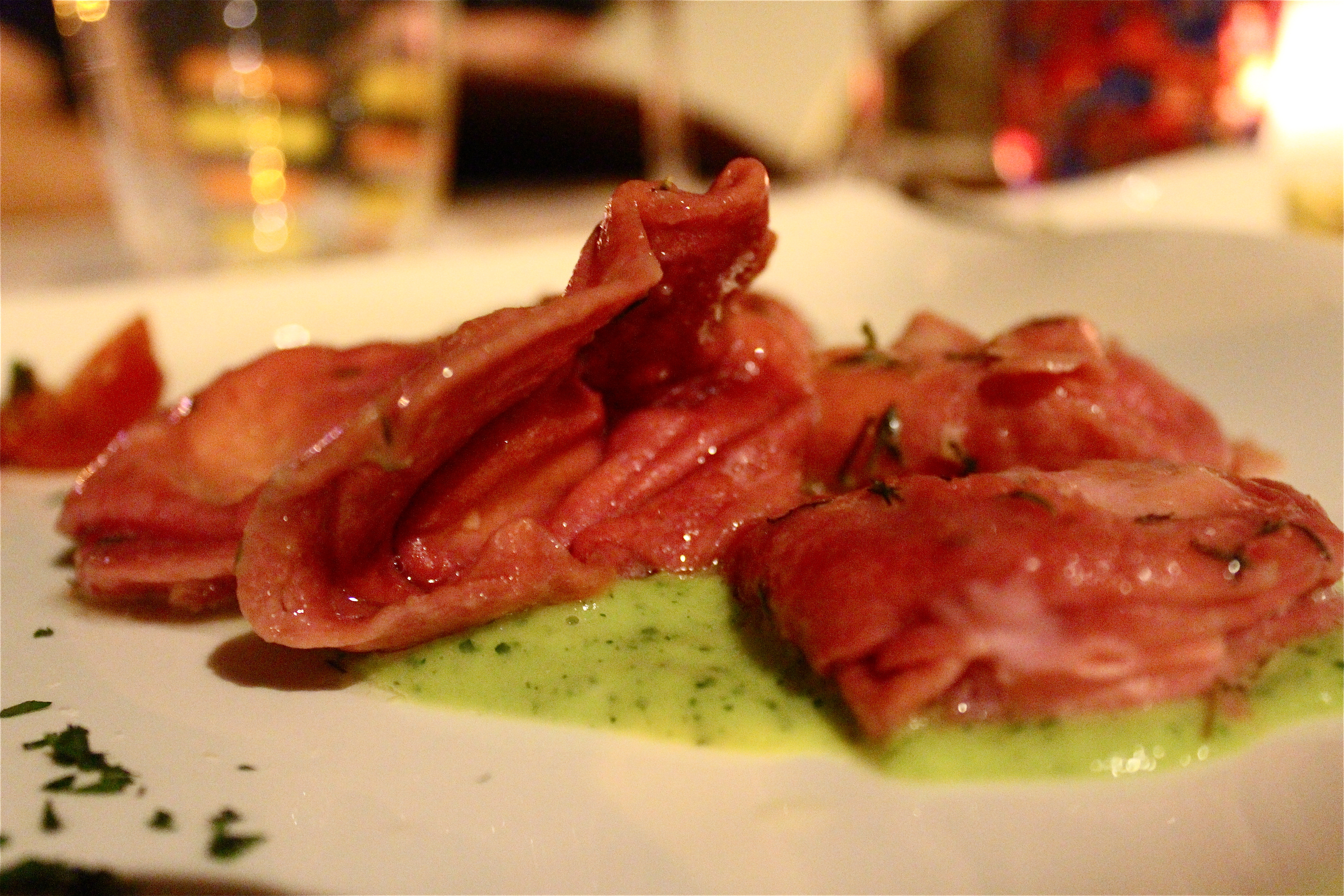 or: Tomato Tortelloni with buffalo mozzarella and bacon on green pesto sauce