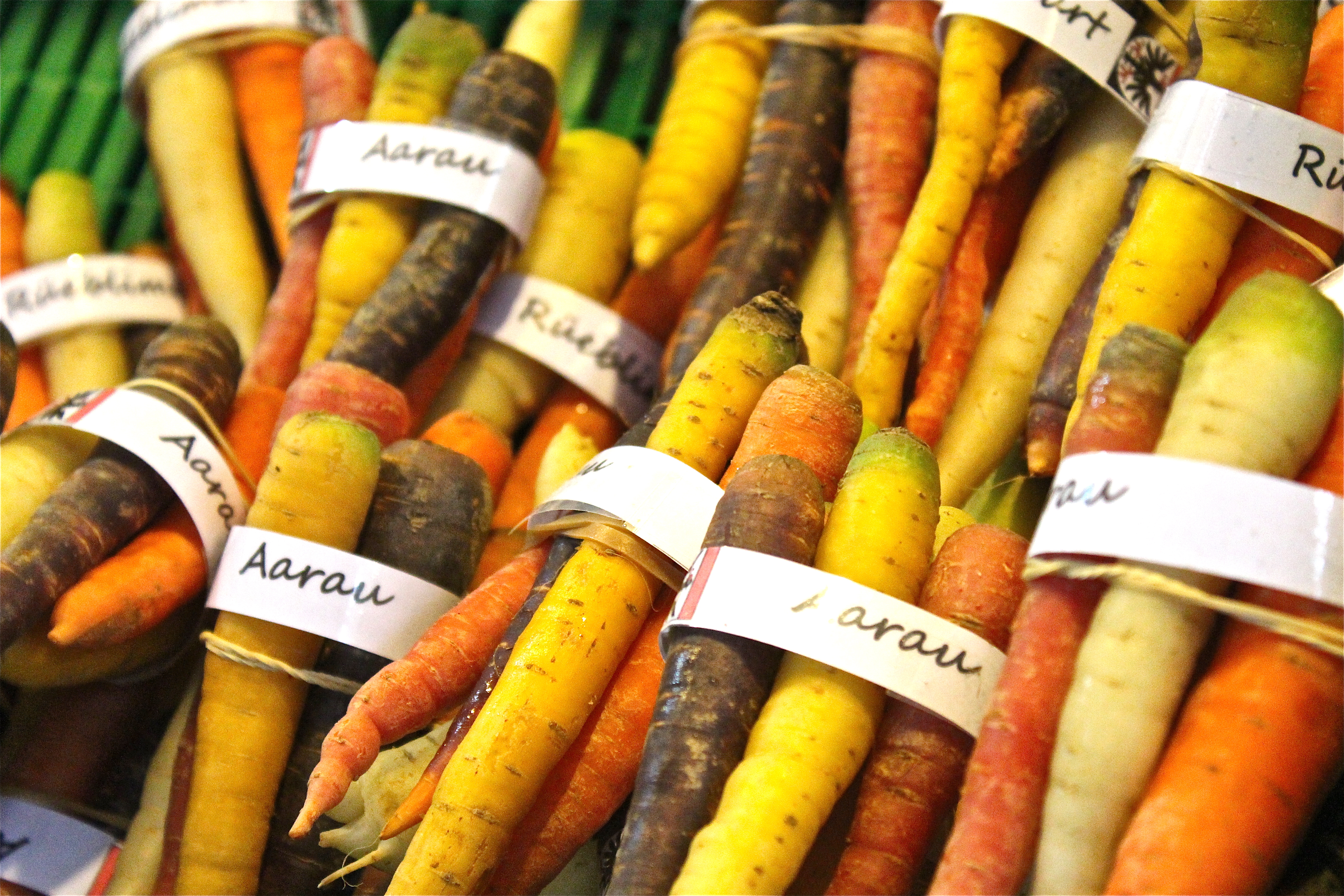 On this last photo you see the “Küttiger Carrot” from the little village Küttigen, next to Aarau. The carrot has a special taste, a little earthy like a potato, with a little sweetness. The classic dish you cook with it is Küttiger Rüebli (Rüebli=Carrot), Potatoes, Ham and 2 different Bacons.