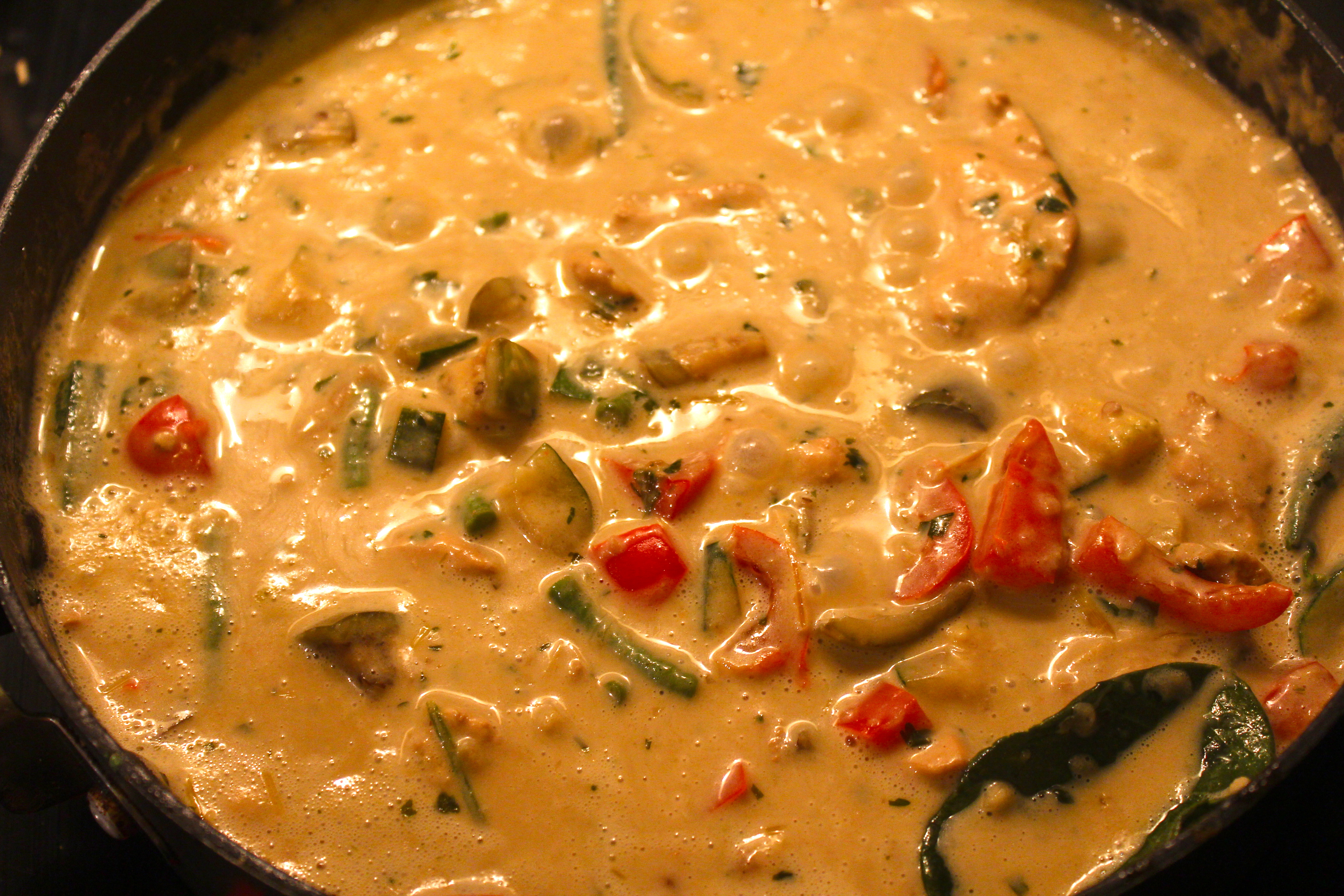 Then put the curry paste into a high frying pan or wok and heat it up. Sear the chicken pieces in the curry paste until they’re getting brown on the outside. You can add some sesame oil to it, if you think it’s not enough in the paste. Add all the vegetables and 2 Tbsp. of salt and let it cook for a few minutes while stirring.