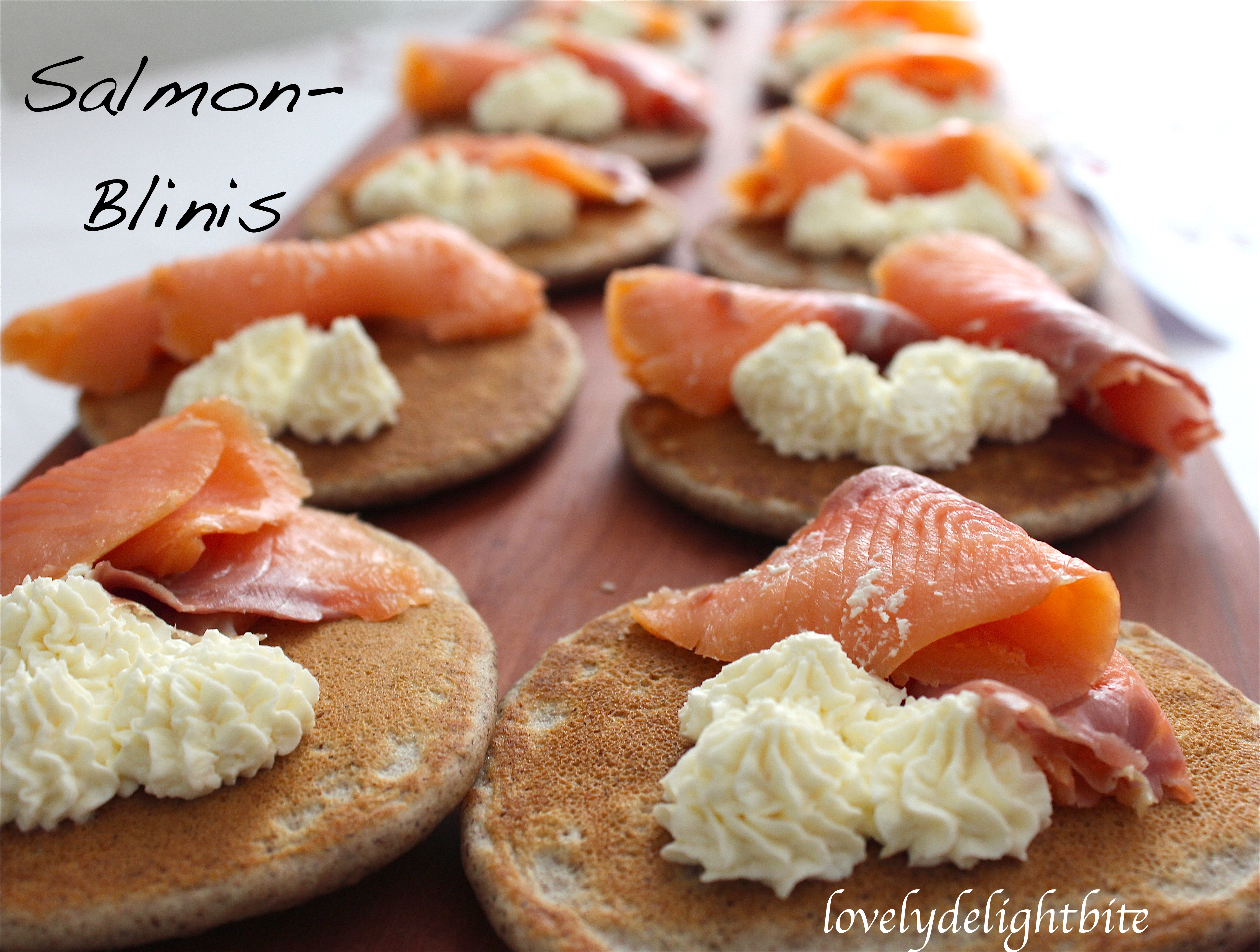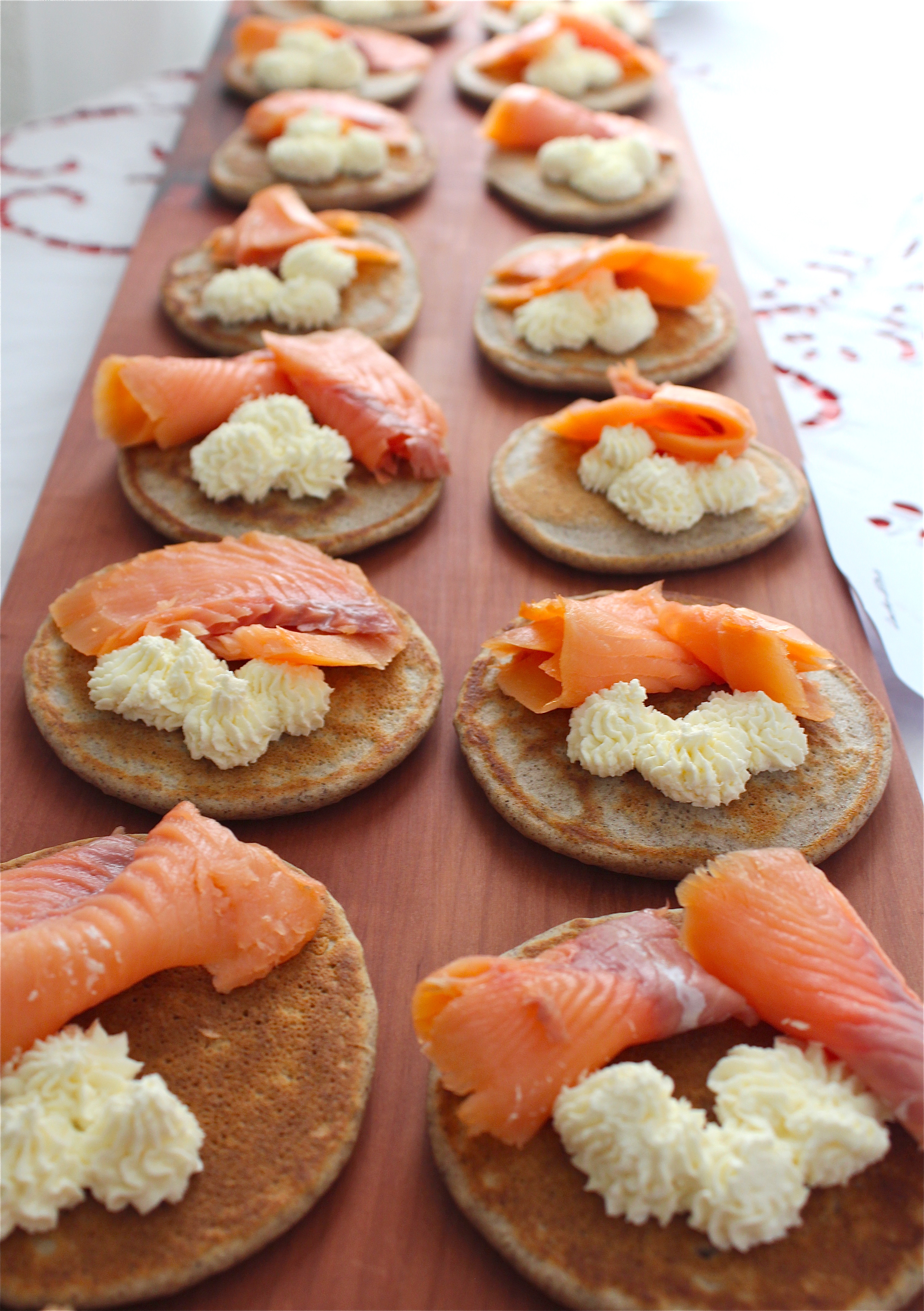 Mix the Philadelphia with the Horseradish Cream and decorate the Blinis with the Cream and the Salmon, Capers and Onions.