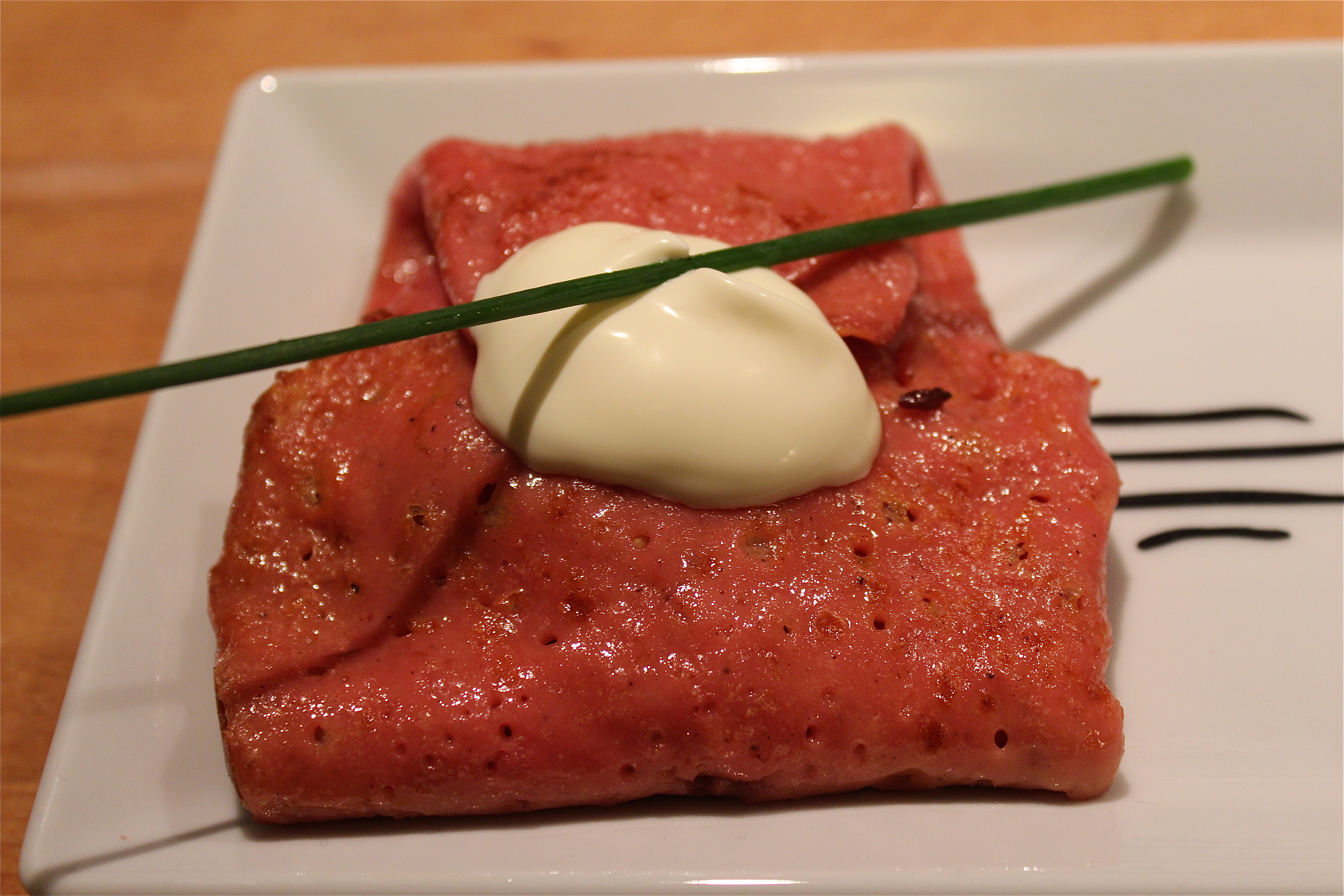 For the Crepe you stir the flour, salt, Pepper, eggs and milk in a bowl to a crepe batter. Then you puree the beet and add it to the batter. The result is a crazy pink colour!