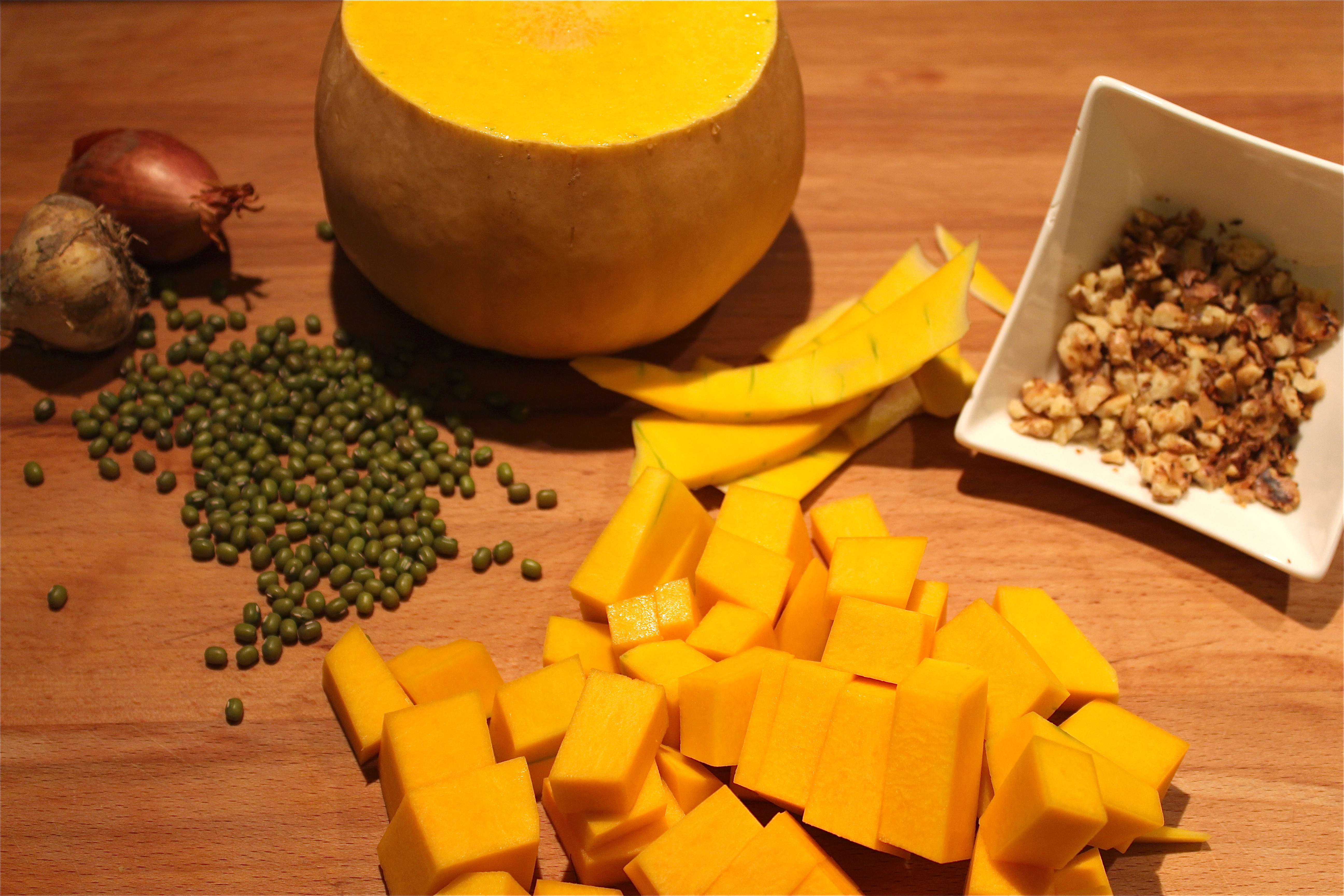 Heat up about 30g of Butter in a high pan and cook the Shallot and Garlic in it. Then add the Pumpkin dices and the cooked Mungbeans. Poor the Bouillon into the pan and add all the spices. At the end season it with Salt and Pepper and let it cook for about 10-15 minutes. Then I purée everything.
