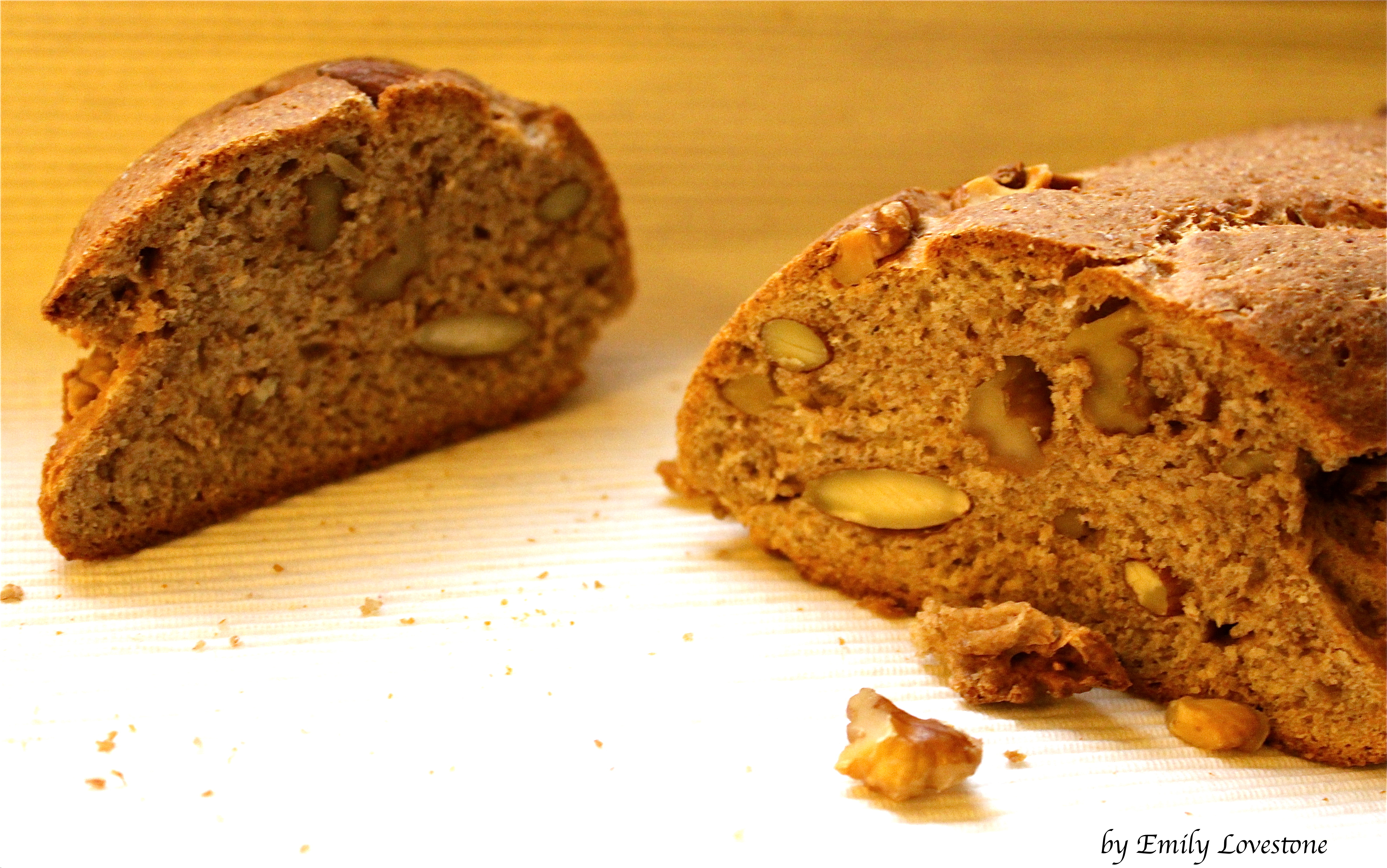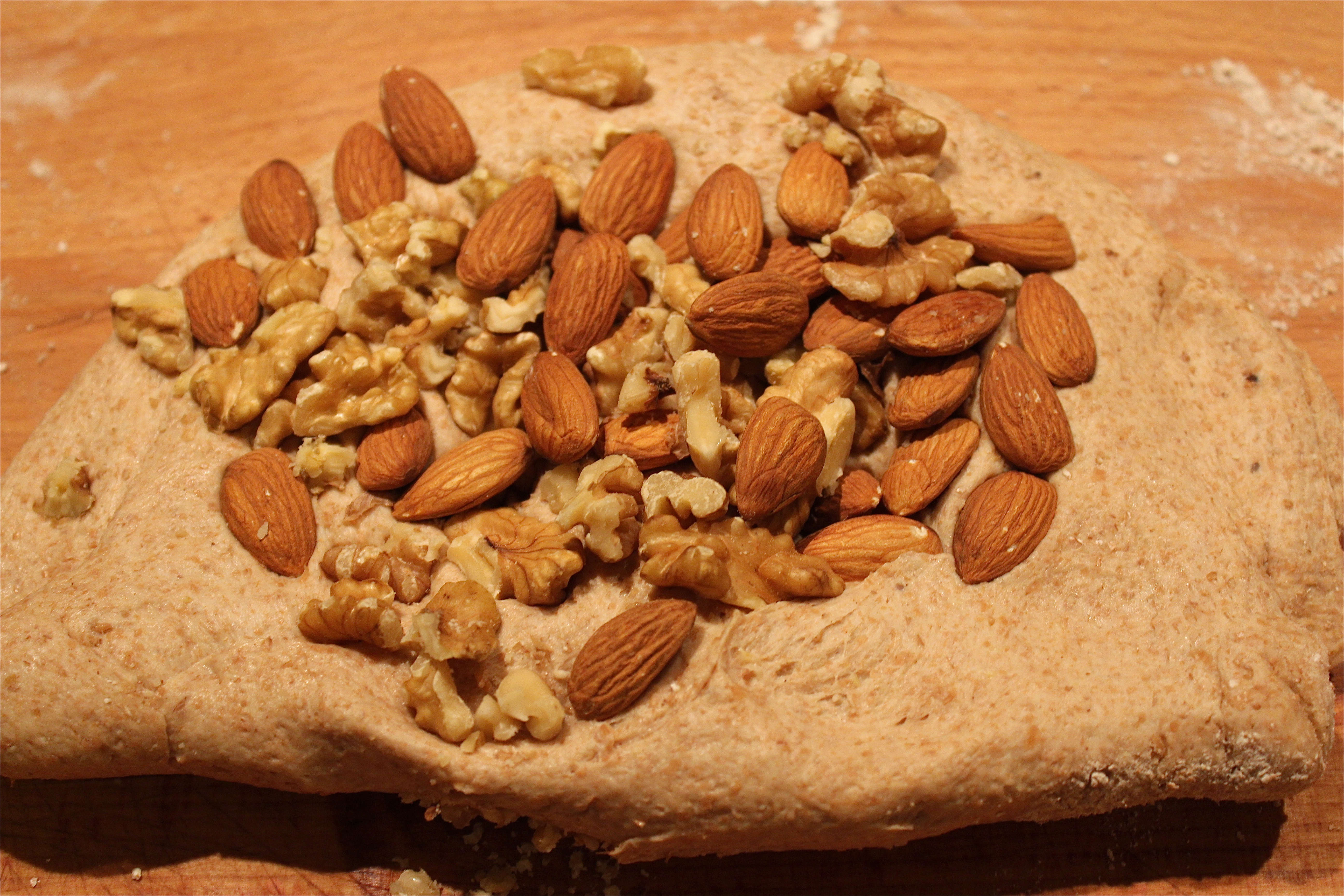 Take the dough out of the bowl and knead it once again. Now add the Almonds and Walnuts to it, then split the dough.