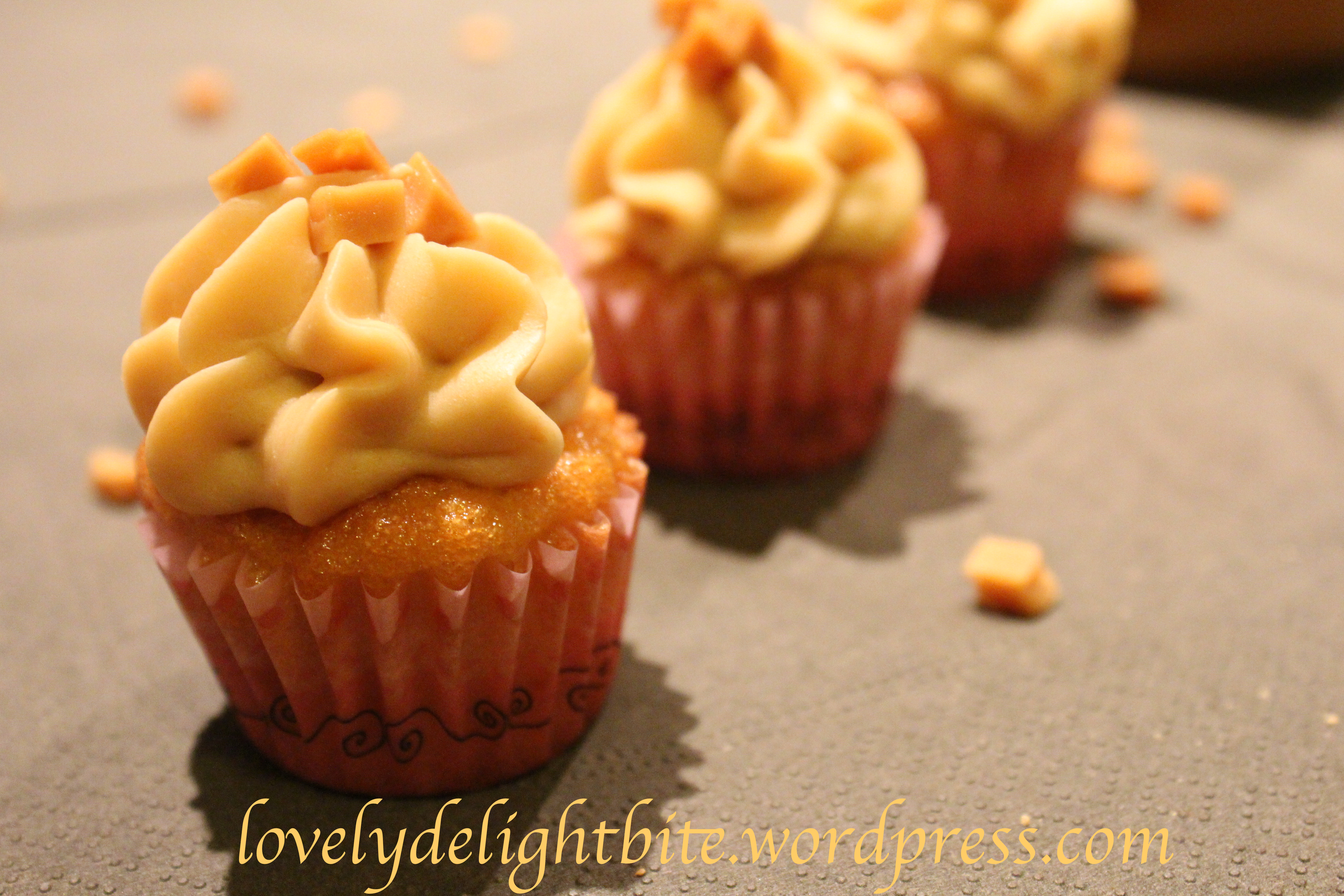 Mix the Butter, Caster Sugar and Caramel Cream well until you have a smooth mixture. Then add the Caramel pieces to it, stir one more time. Frost the Cupcakes.