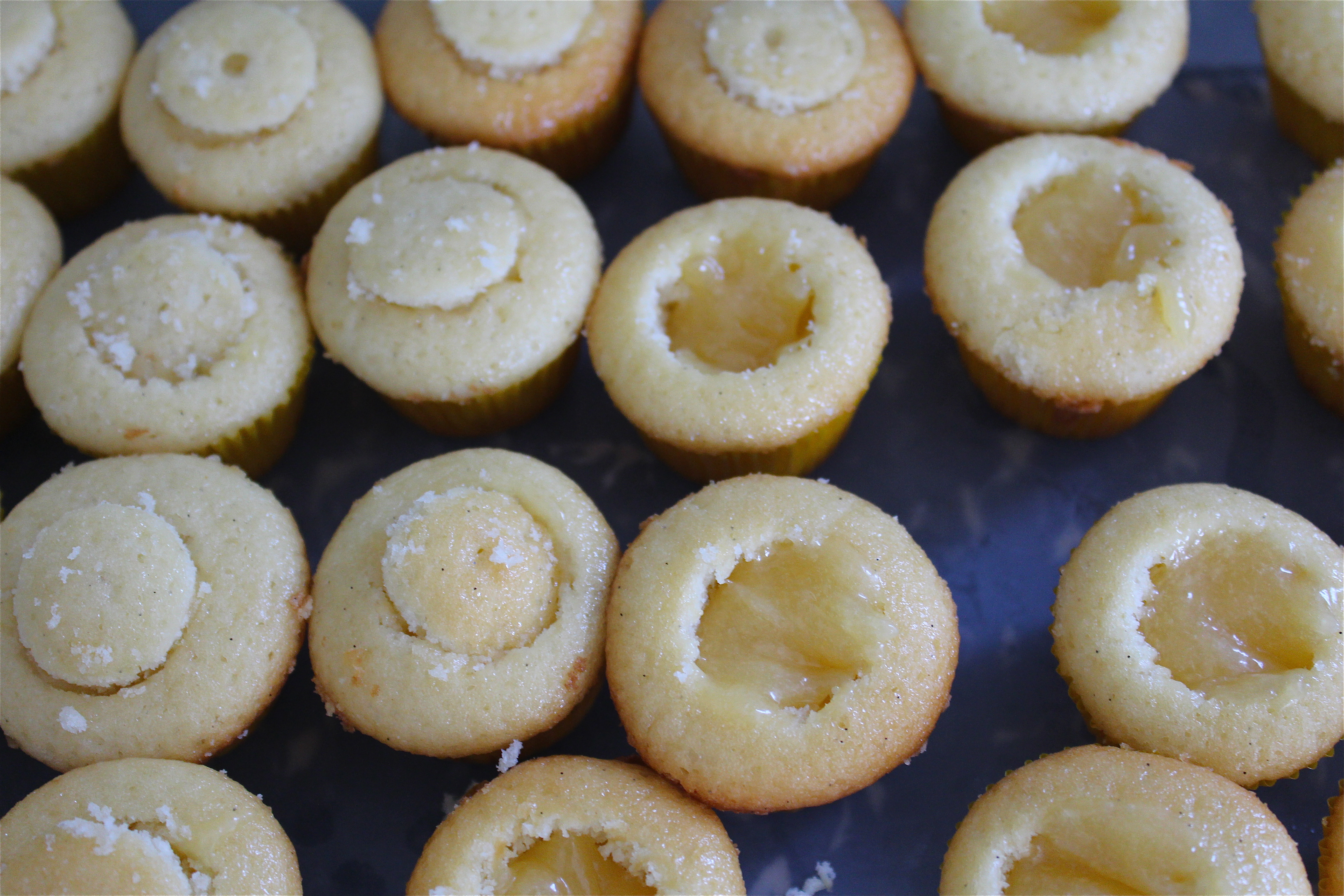 Make a hole in each cupcake and fill them with the Lemon curd. Put the cake top back on.