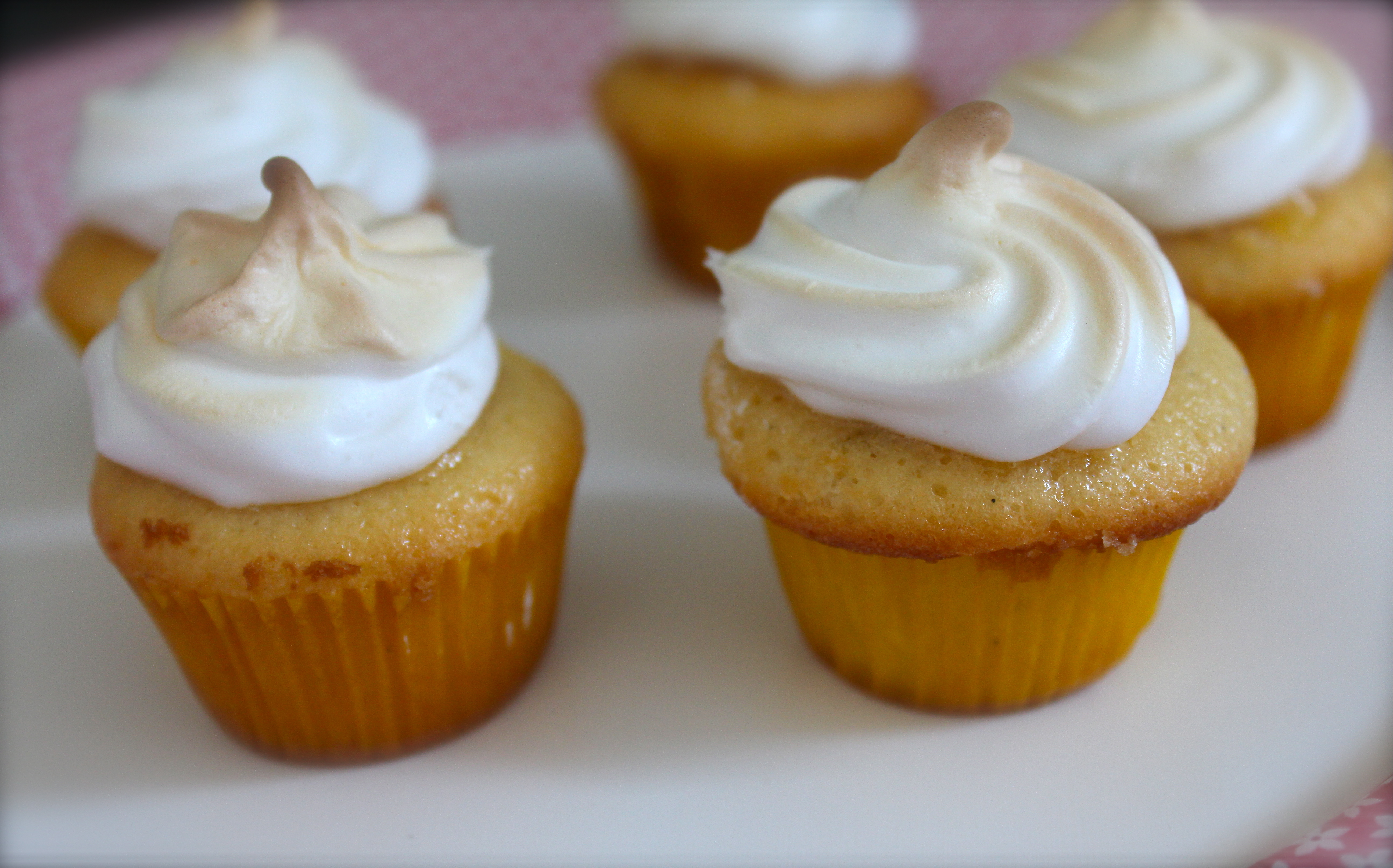 Whisk the egg whites with the salt and add sugar gradually. Continue to whip until stiff peaks form. Continue beating for 2 minutes. Place the meringue on the cupcakes and bake the cupcakes by 390F (200°Grad) until the Meringue gets lightly golden brown.