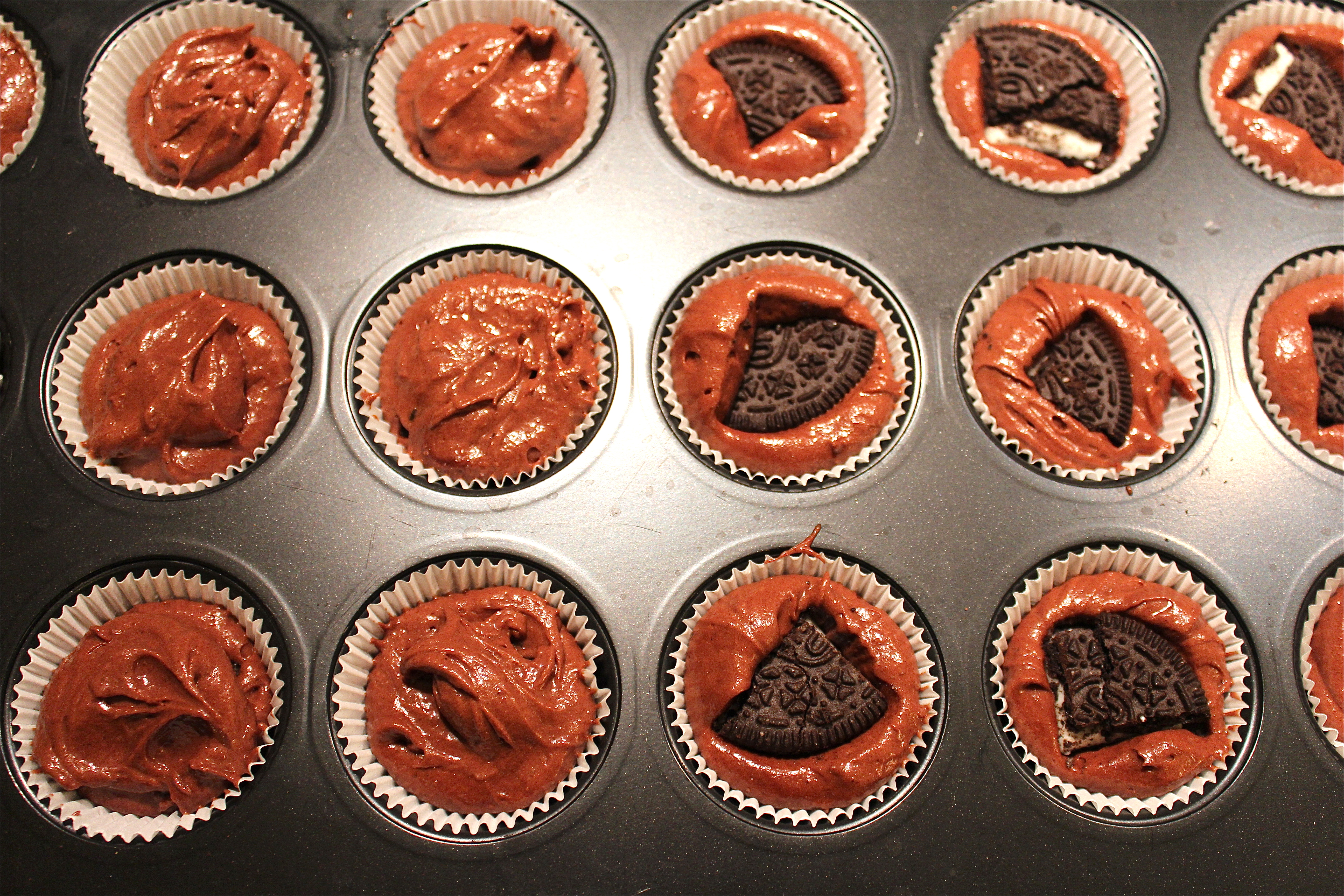 Fill the cupcake cups half with the batter, place an Oreo on top (or a quarter), then cover it with more batter.
