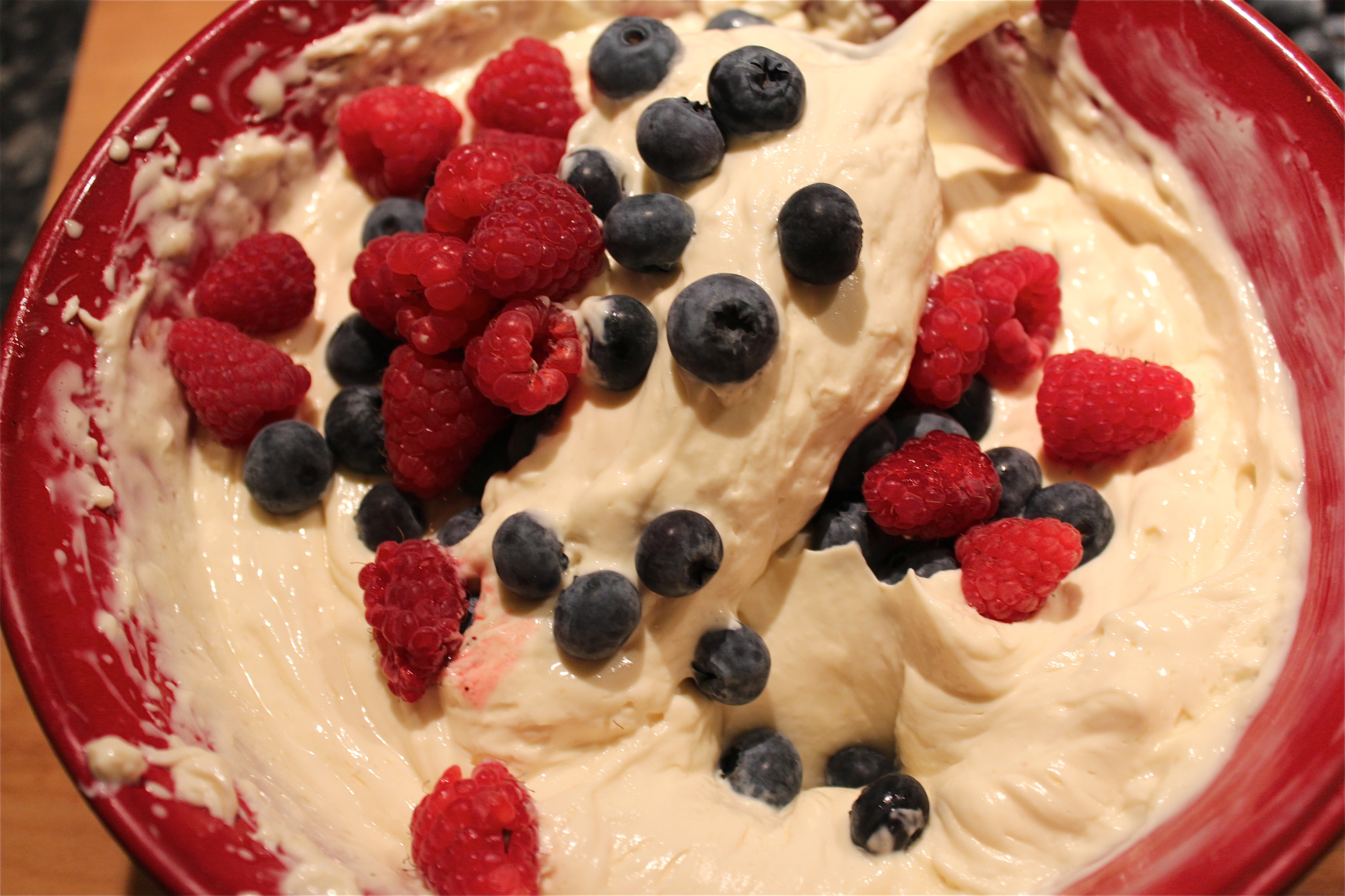 Mix the cream cheese, sugar and vanilla sugar well. Then mix the eggs one by one well into the mixture. At the end you mix the 200g fresh berries with a spoon gently underneath it.
