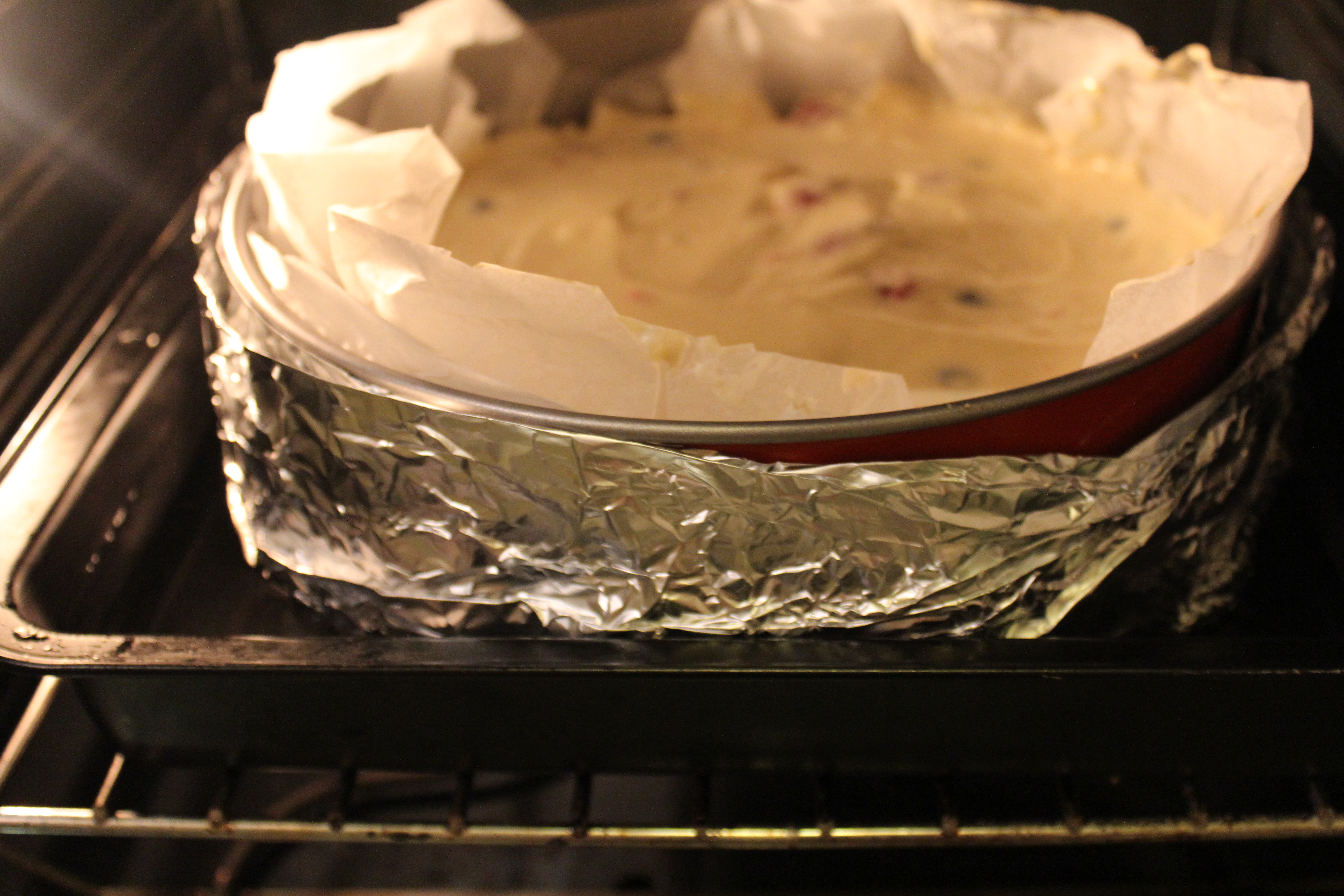 Bake the cheesecake for 1 hour. Then take the form out of the tin and let it cool on room temperature.