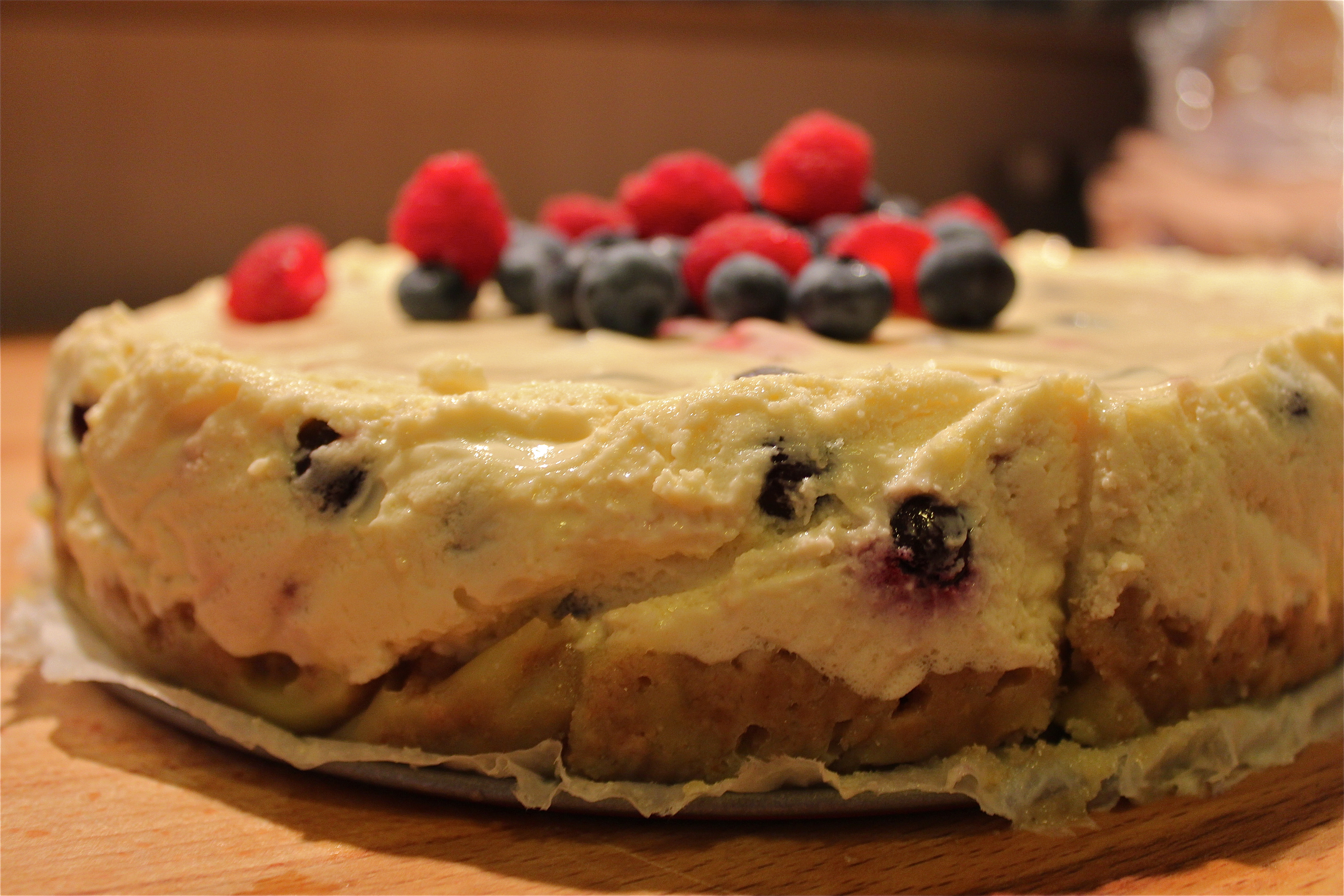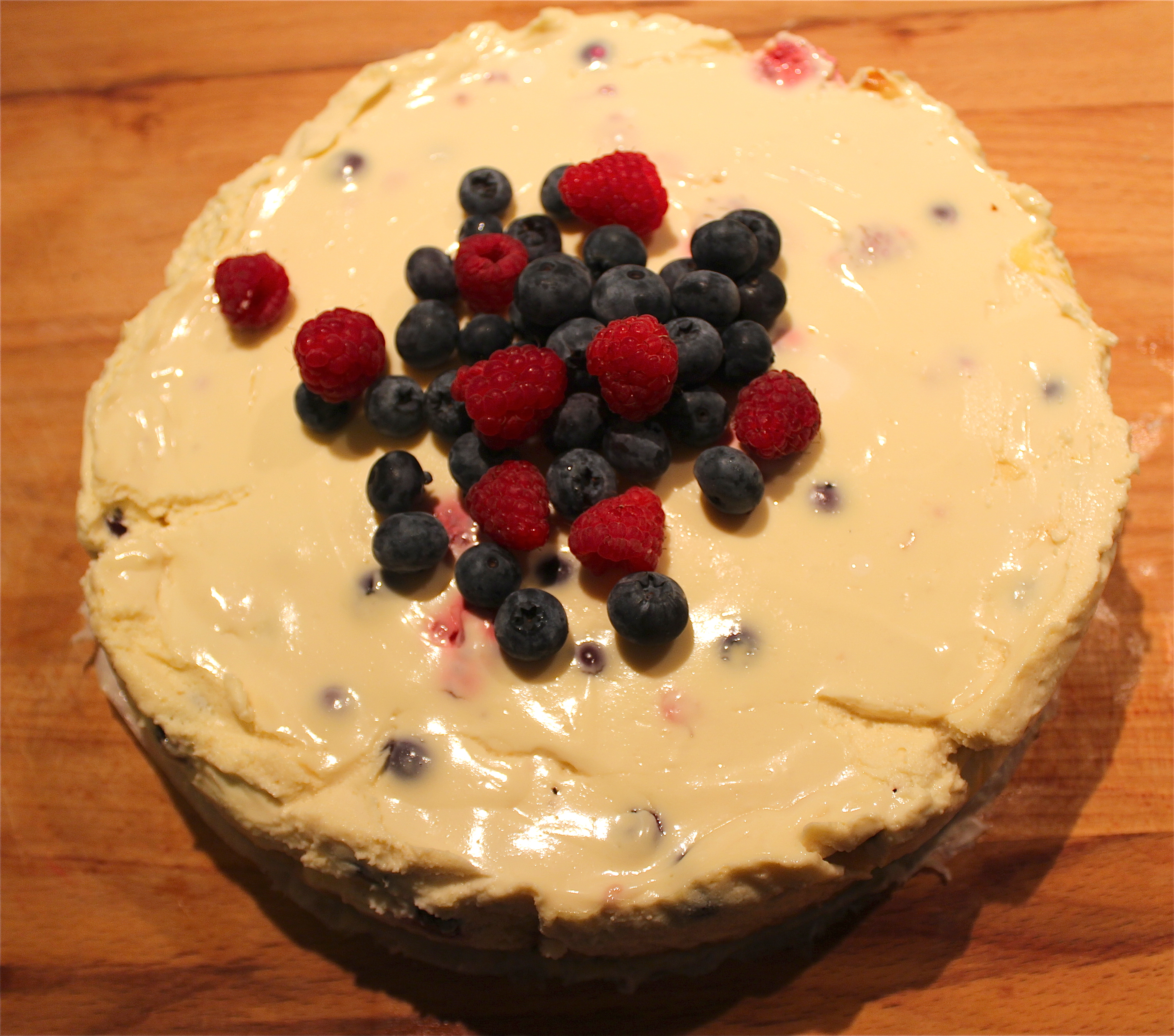 Before you serve it, take it out of the spring form and decorate it with fresh berries.