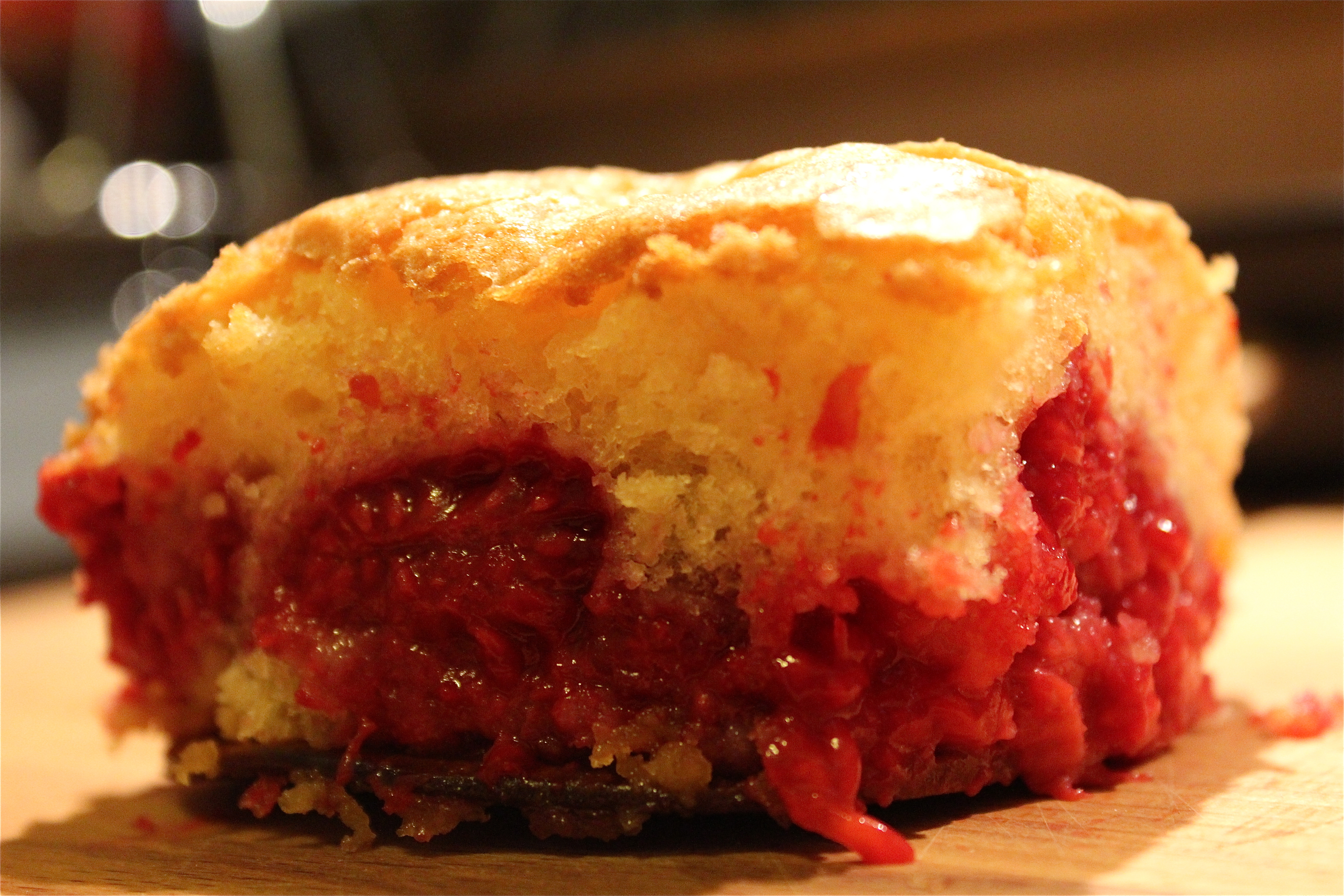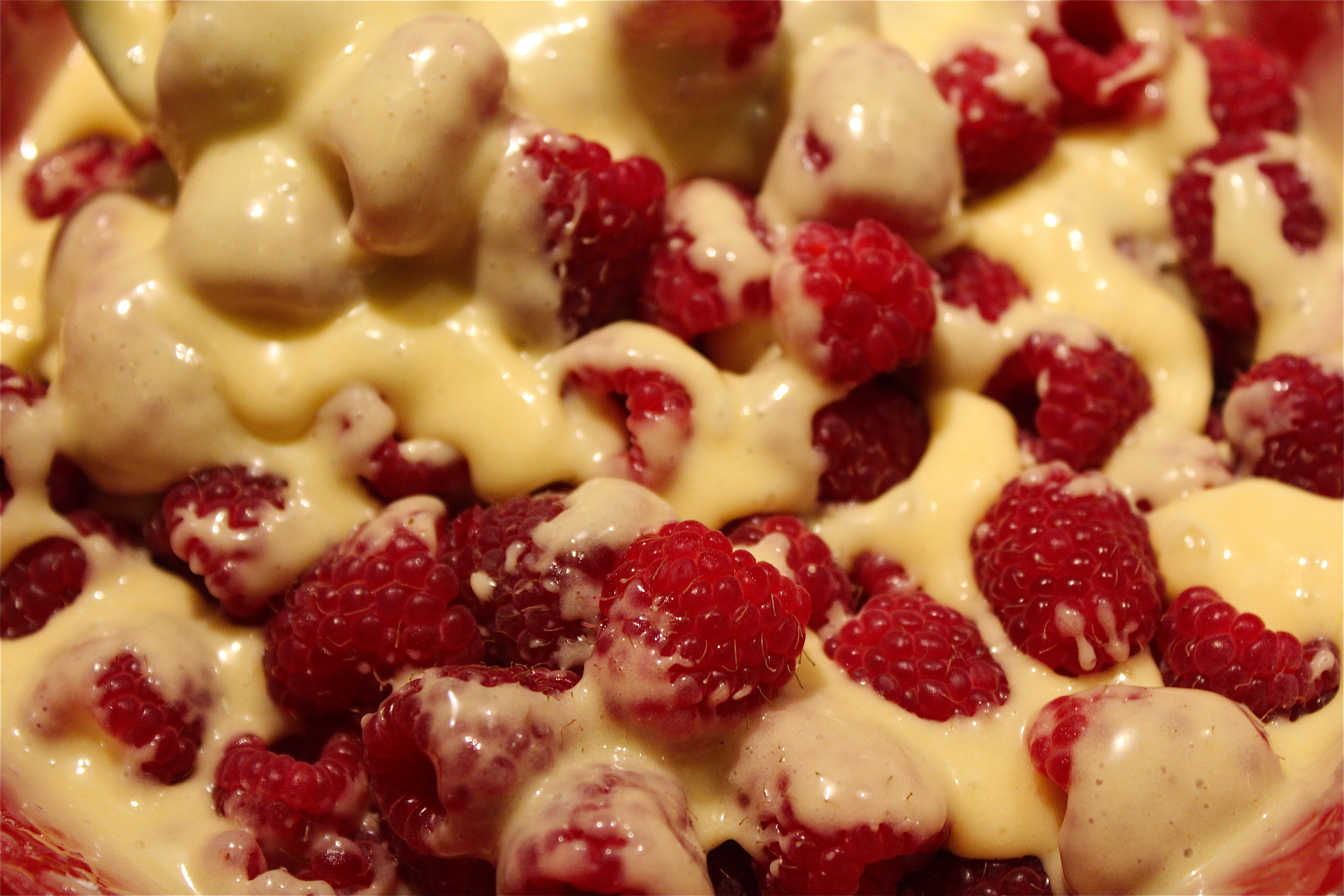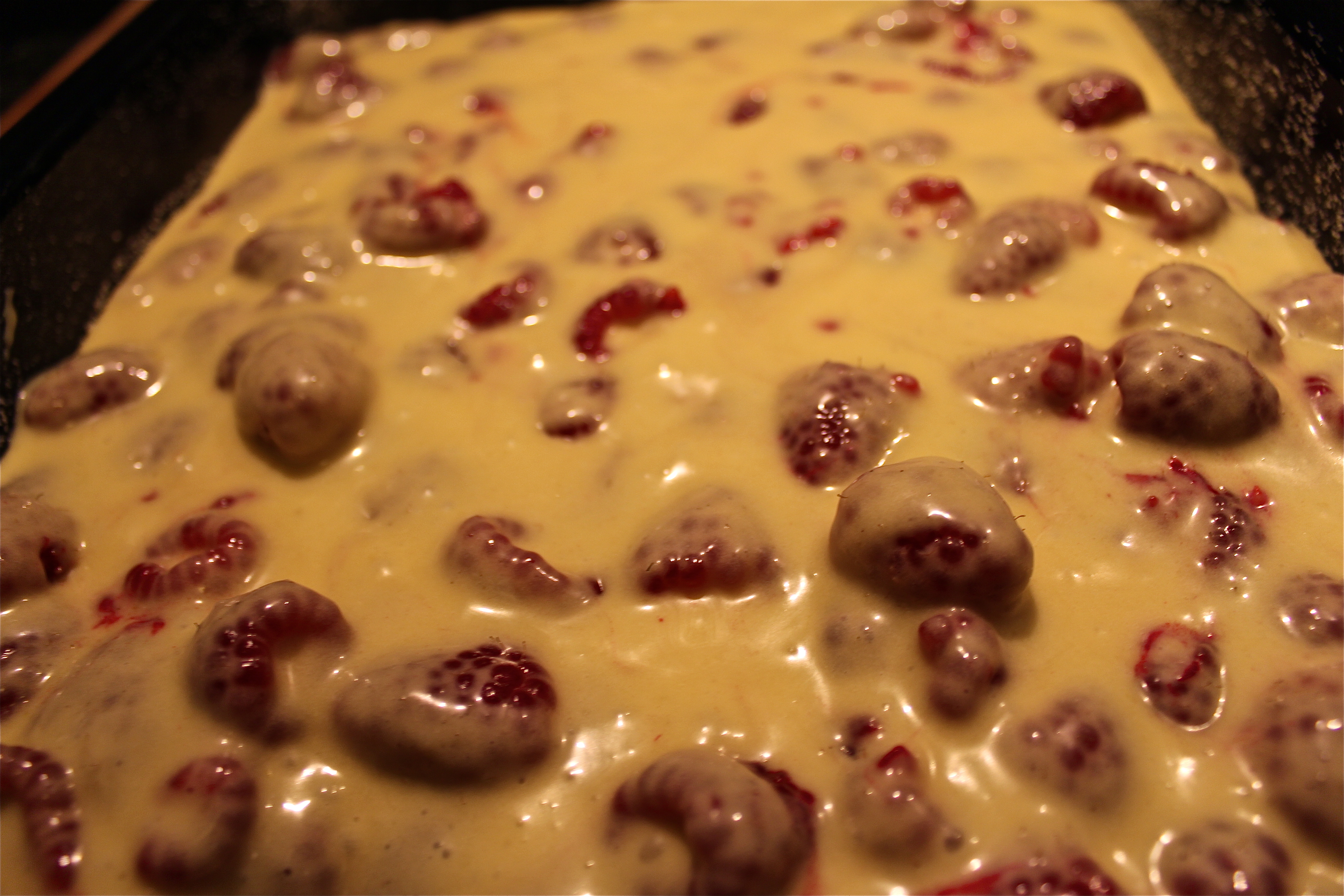 Then add the raspberries gently to the batter with a spoon. Fill the batter into the tray.