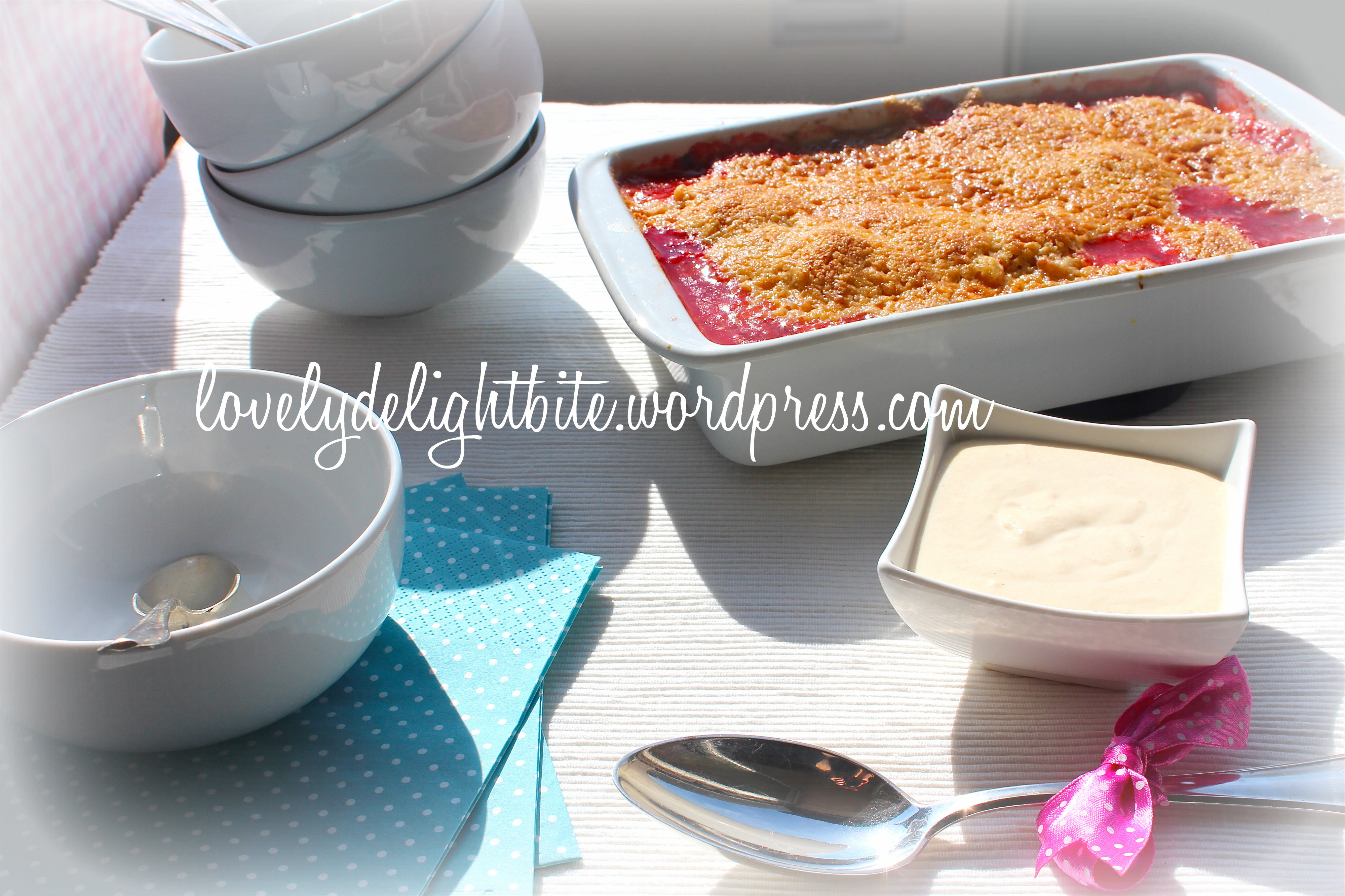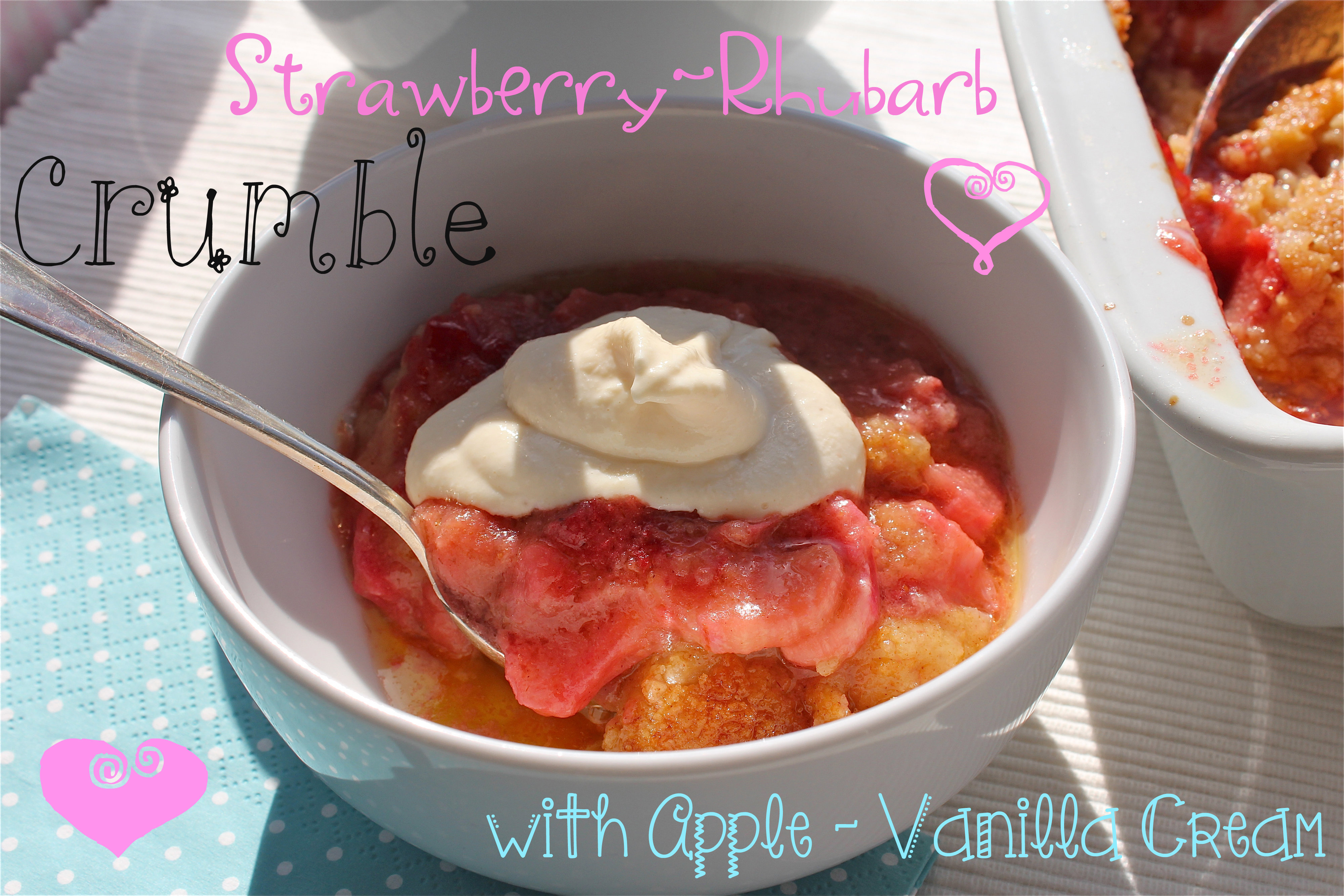 Prepare the Cream by mixing the Soy whipped Cream (or Mascarpone), Vanilla Sugar, scratched Beans from a Vanilla bean, Caster Sugar and the Apple sauce well together and serve it to the warm Crumble.