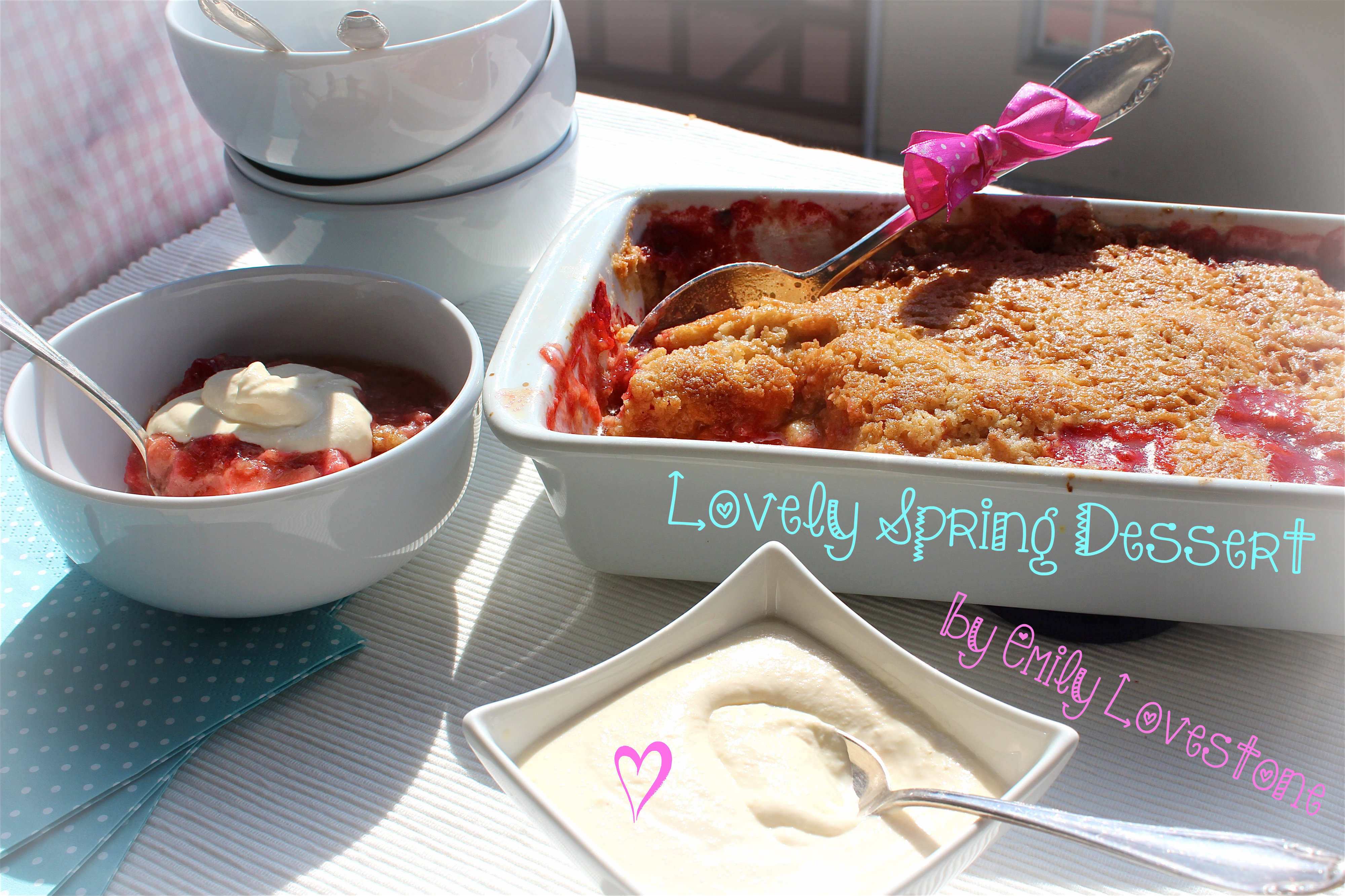 Mix the Strawberry and Rhubarb pieces in a bowl with the Port wine and the 2 Tsp. of brown Sugar. Then fill it in an oven form.
