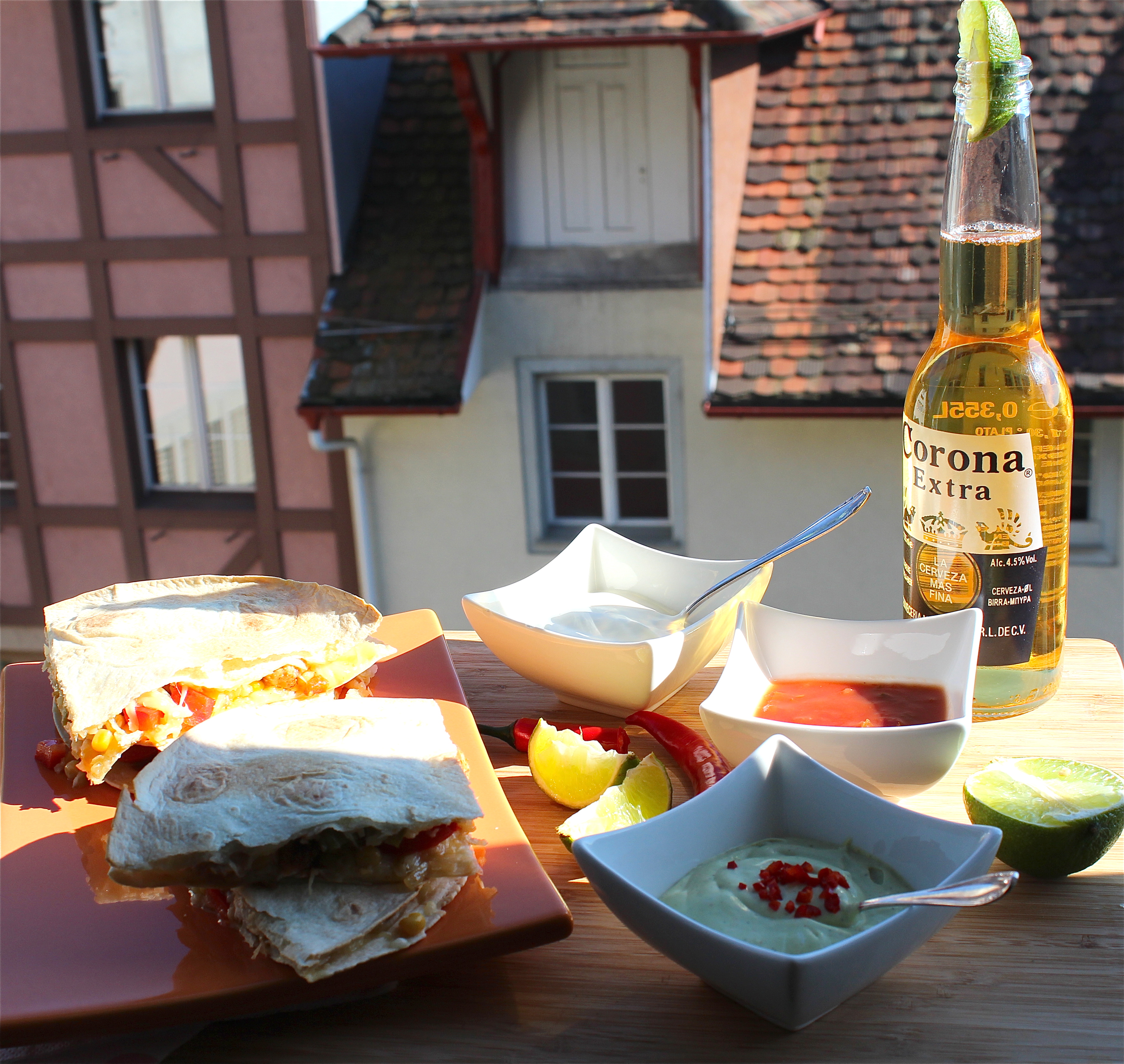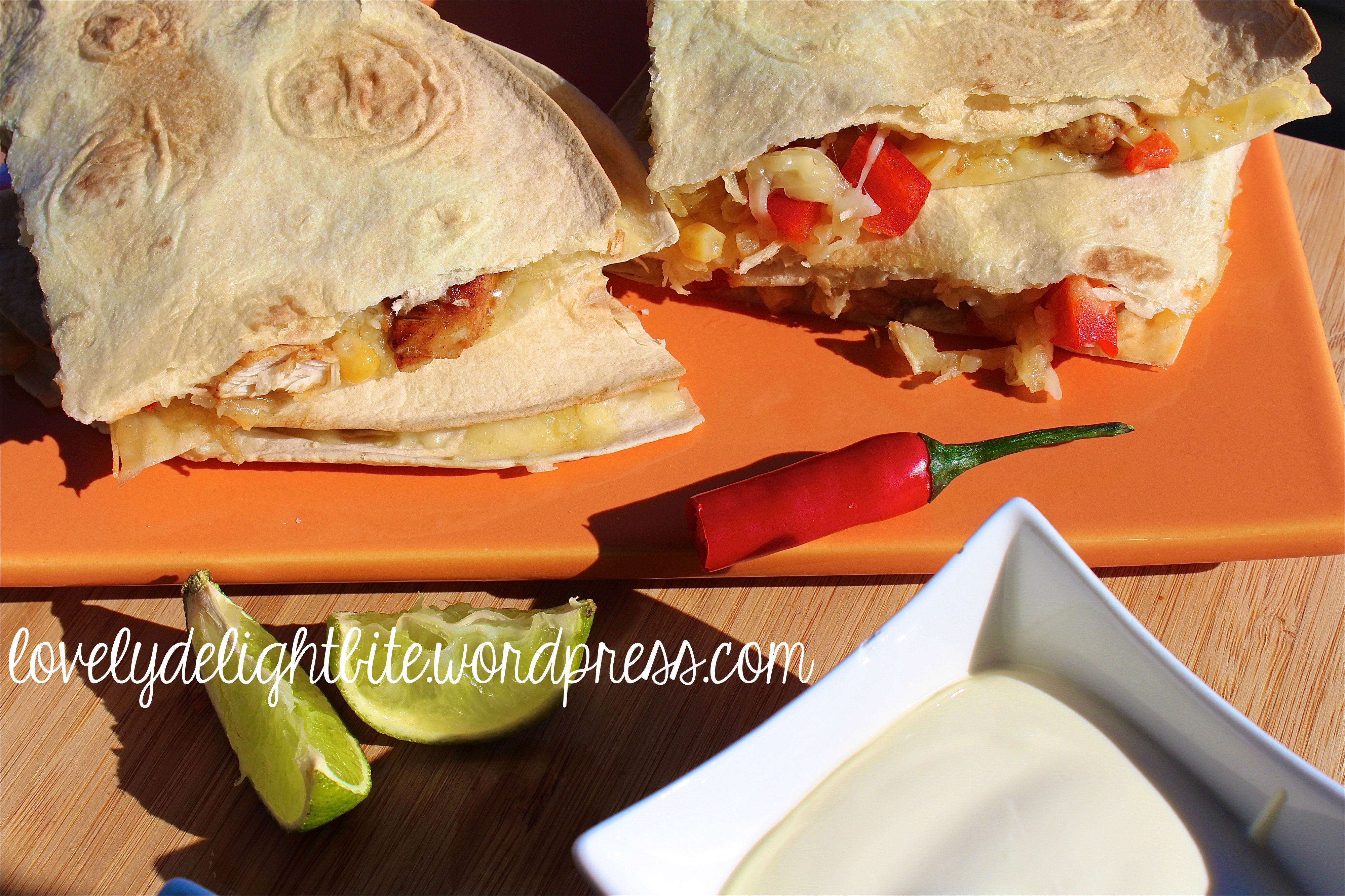 Take one Tortilla on a baking tray and cover it with Cheese, then the Chicken, sweet Pepper pieces, Jalapeno and Corn and finish again with Cheese. Lay the second Tortilla on top.