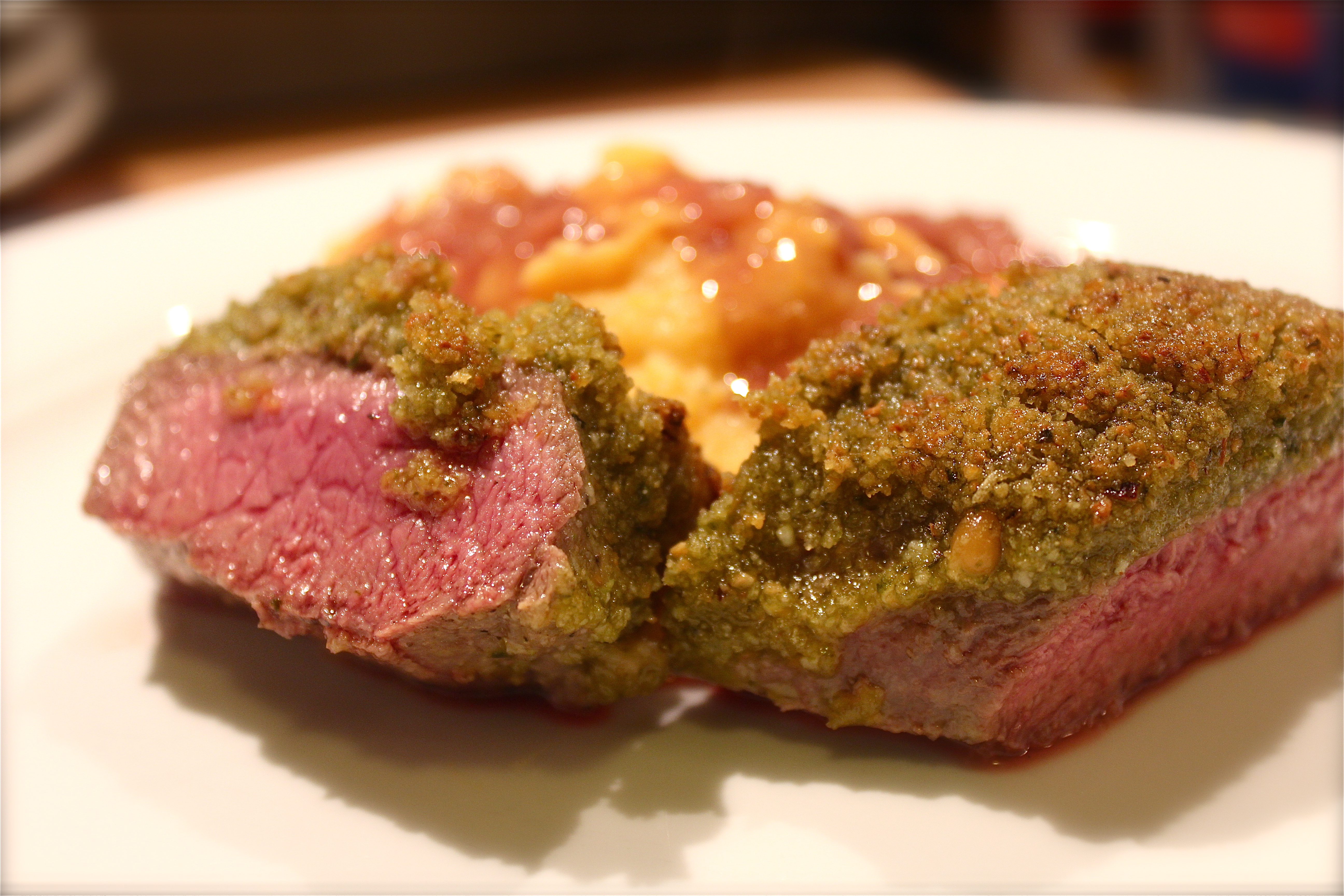 While the sauce is cooking, take the mortar and pestle the basil, pine nuts, 1 clove of garlic, parmesan and the olive oil to a paste. Then add the breadcrumbs and mix it well. Pile the mixture equally on the meat. If it’s not moist enough, add more olive oil. Put the meat on the tray in the preheated oven for 7 minutes.