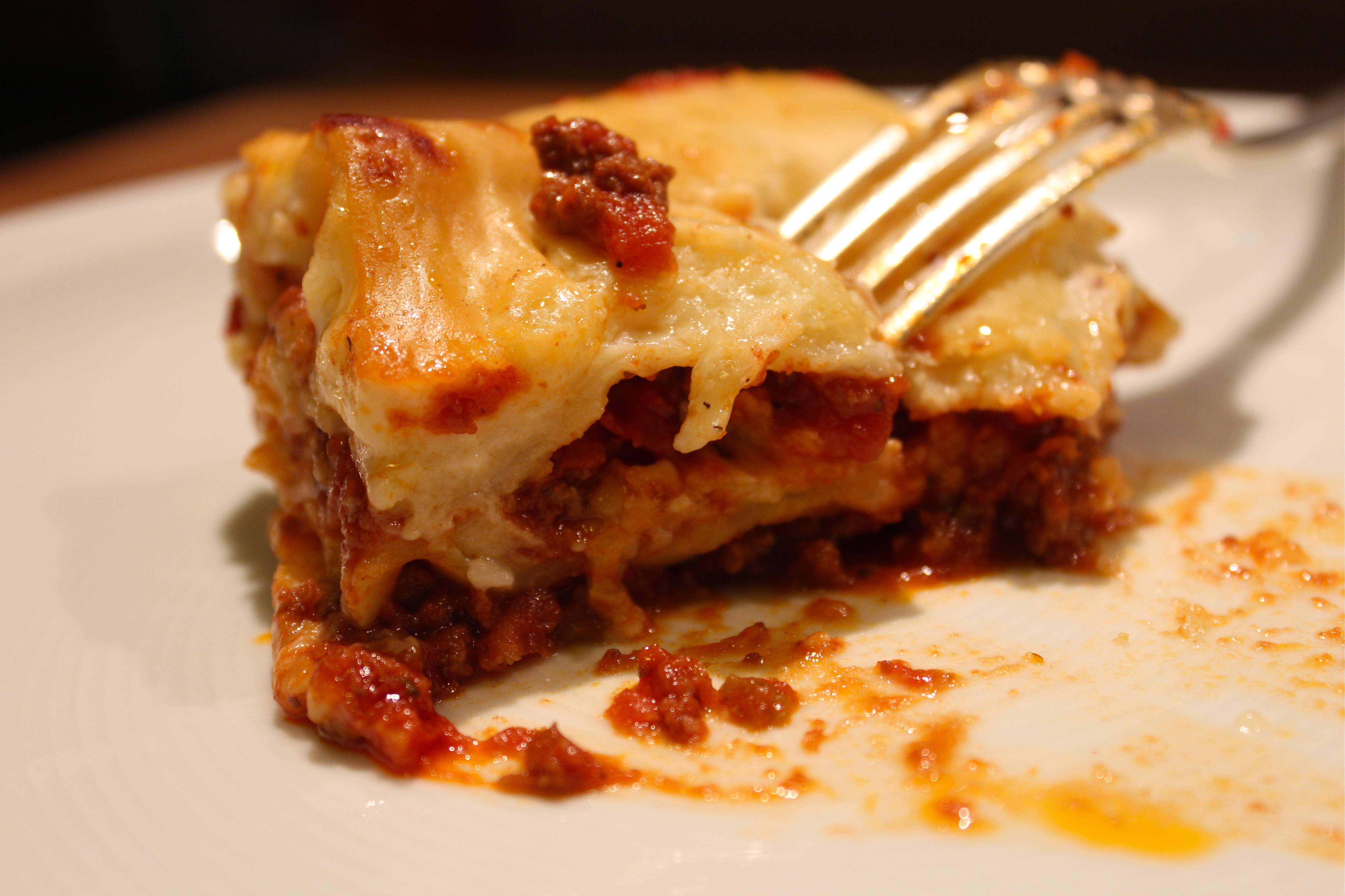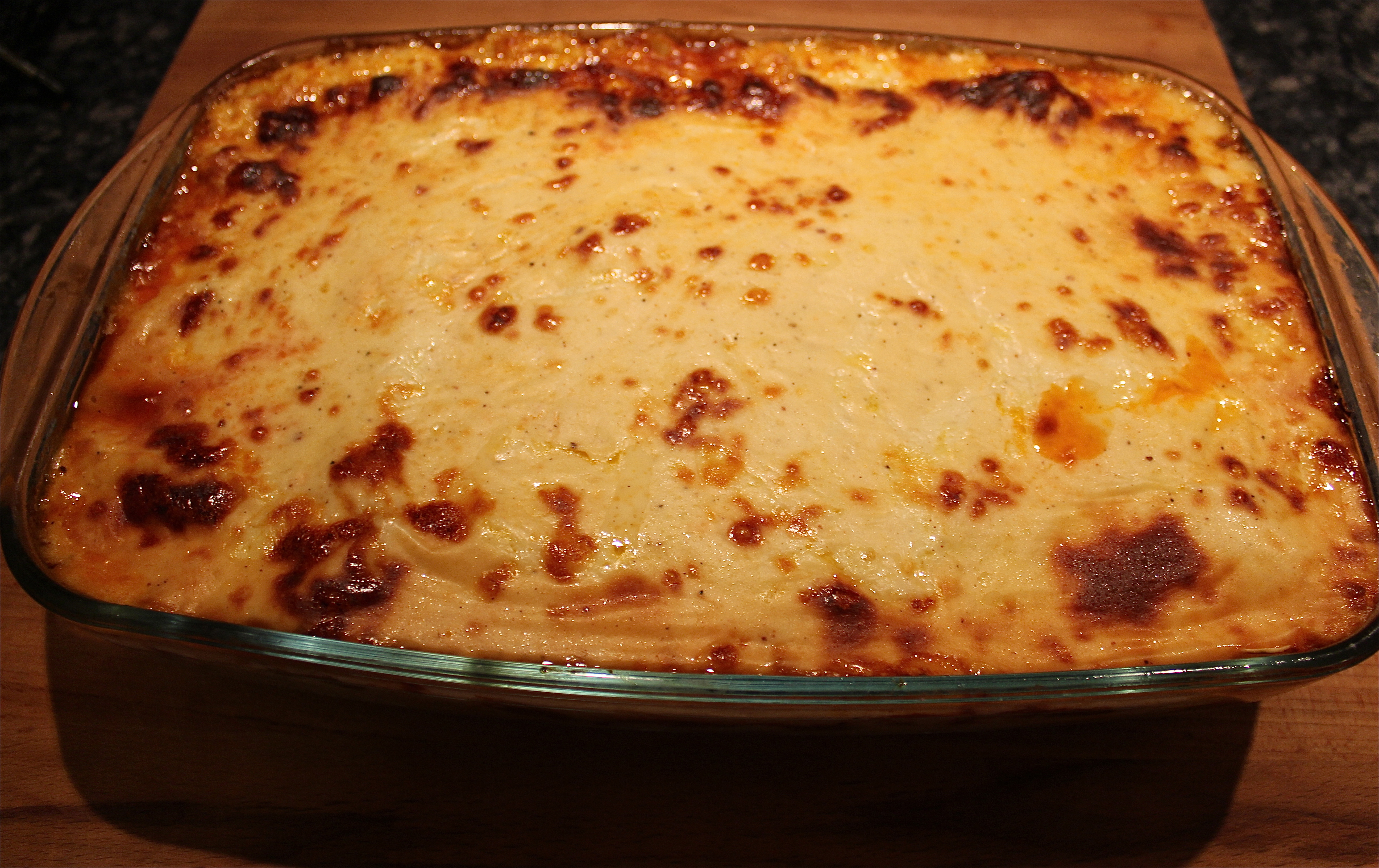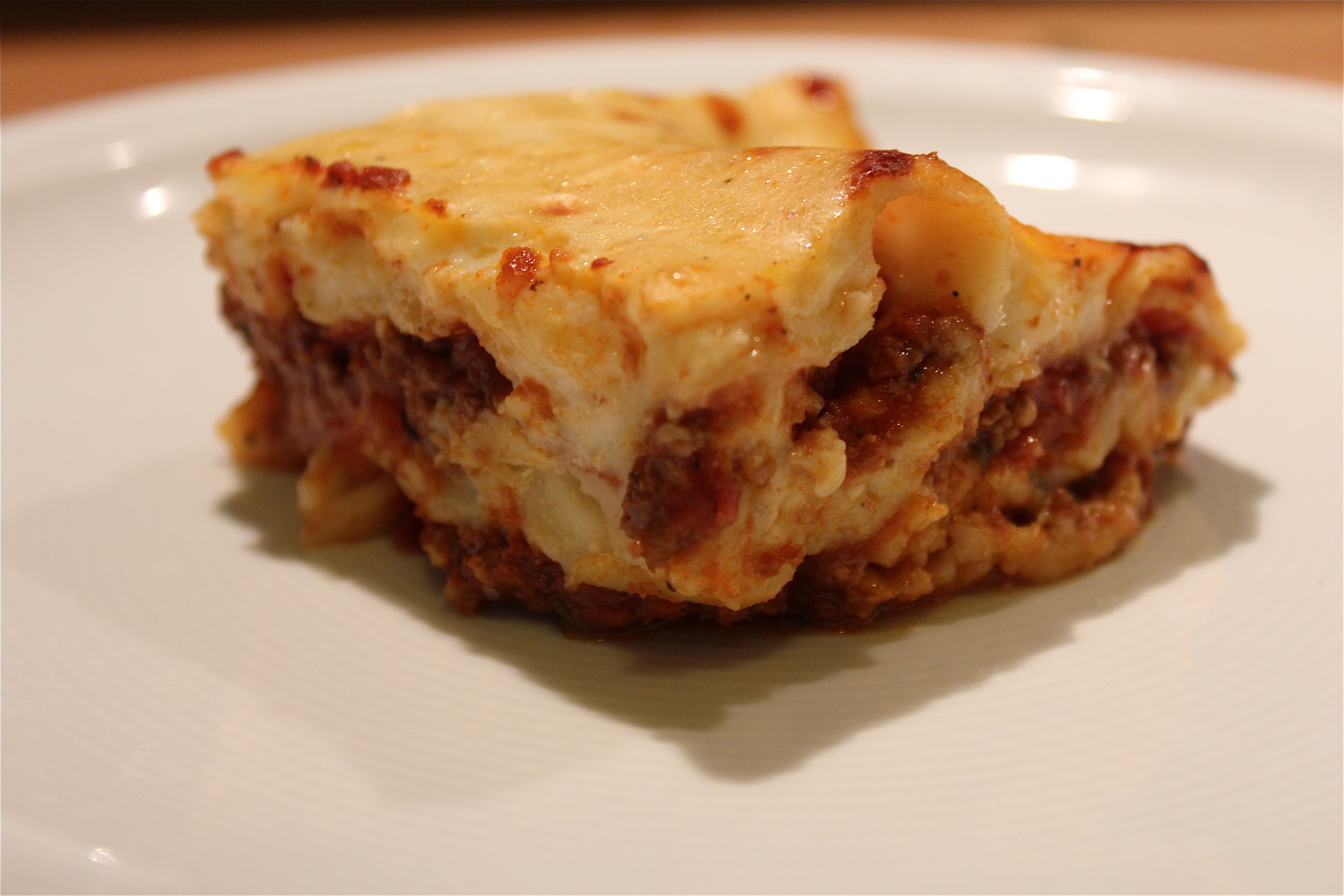 Now take a Lasagna dish and start the first layer with the ragu, then the uncooked pasta sheet layer (crack some in pieces to fill the gaps. On top you give the bechamel sauce, then the cheese. Continue with the layers until the ingredients are used up and finish with bechamel sauce and cheese. Mine has 2 layers of everything.