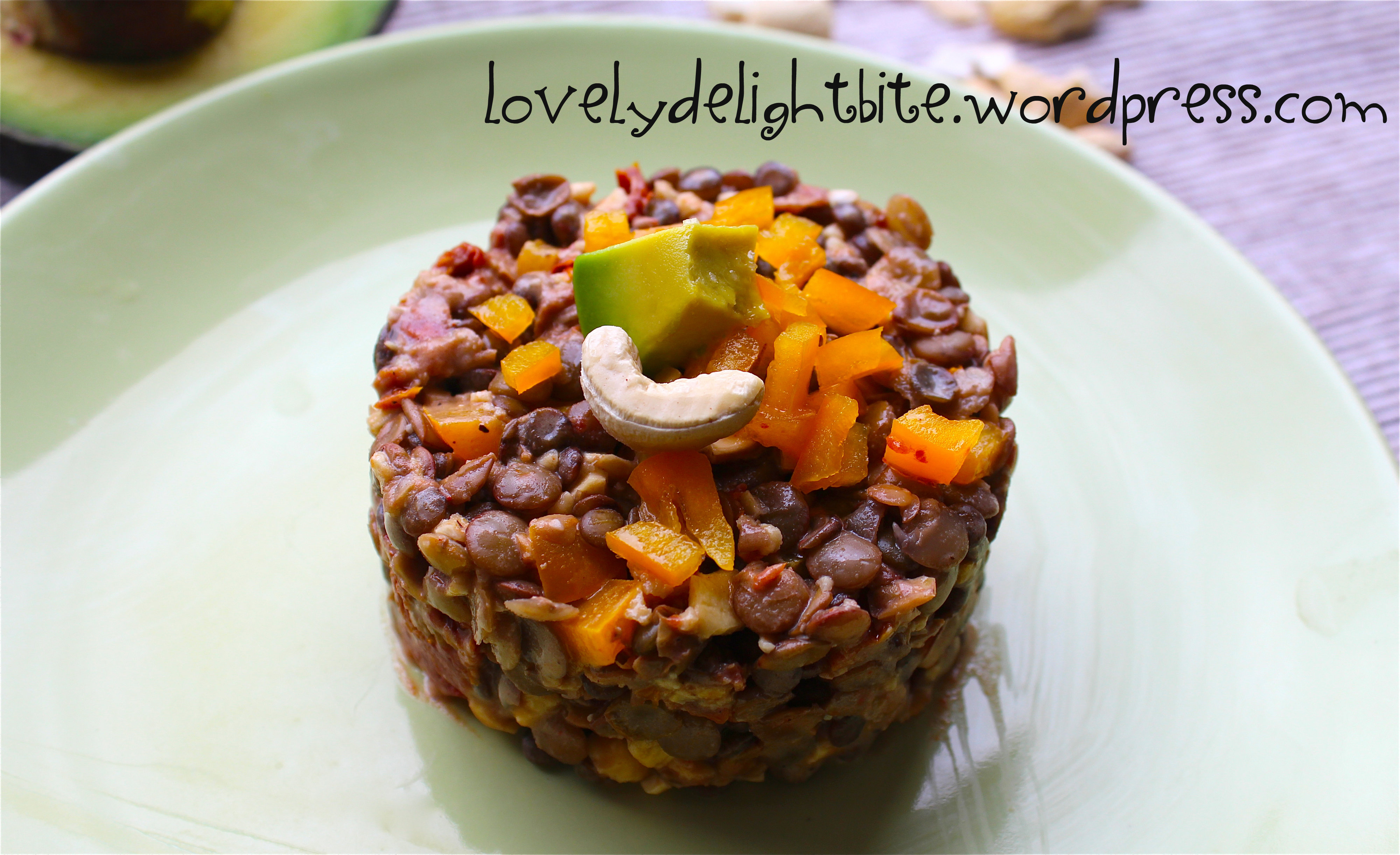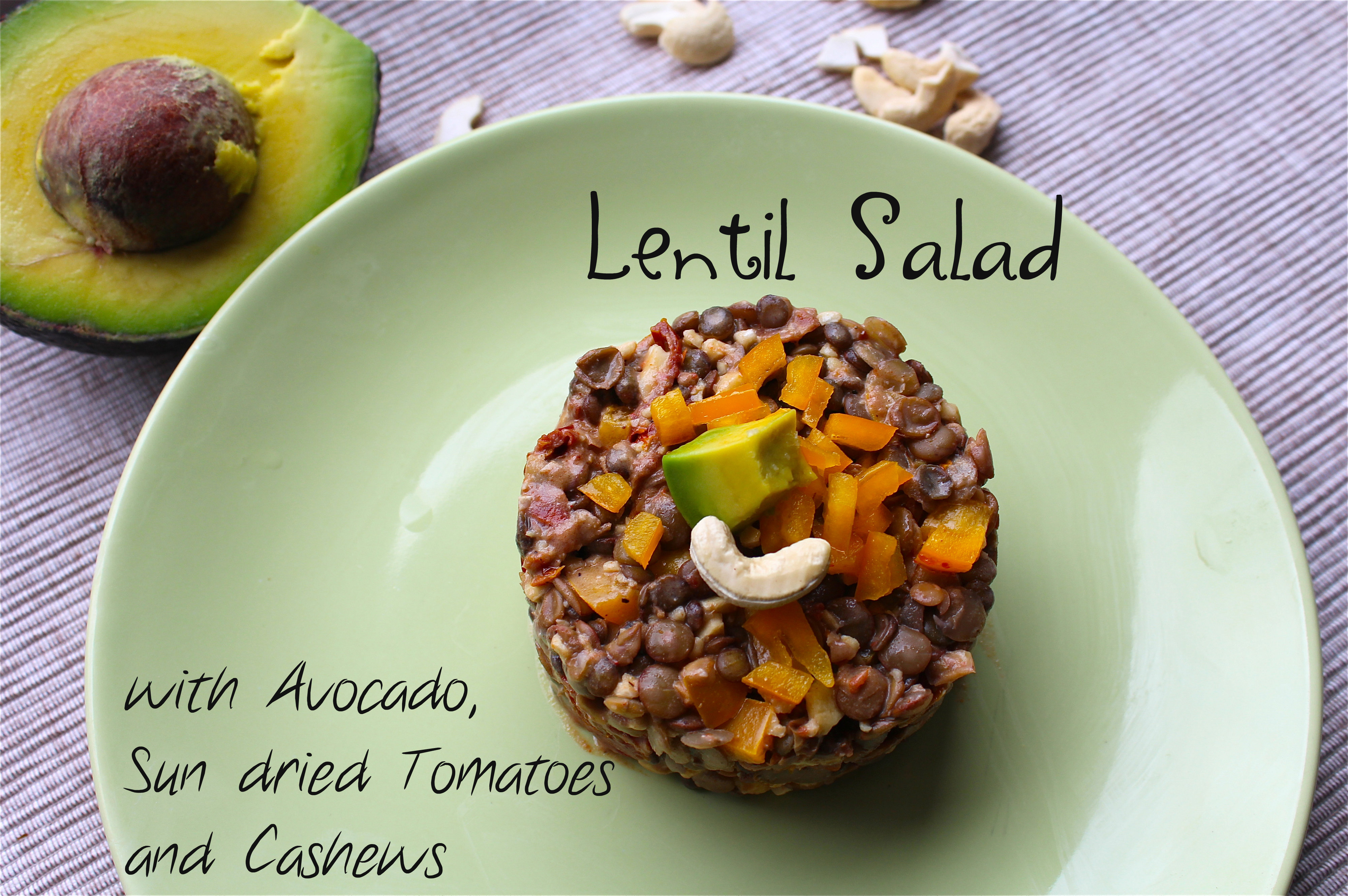 Cover the lentils in a Pot with water. Cook them, until they’re soft. Prepare the salad dressing in a salad bowl, by mixing all the dressing ingredients and stir them. Chop the onion and cut the pepper and tomatoes in little pieces. Cut the Avocado in larger pieces and add all of it to the Dressing. After the lentils cooled down you can add them and the Cashews to the bowl and mix all of it. Season to taste.