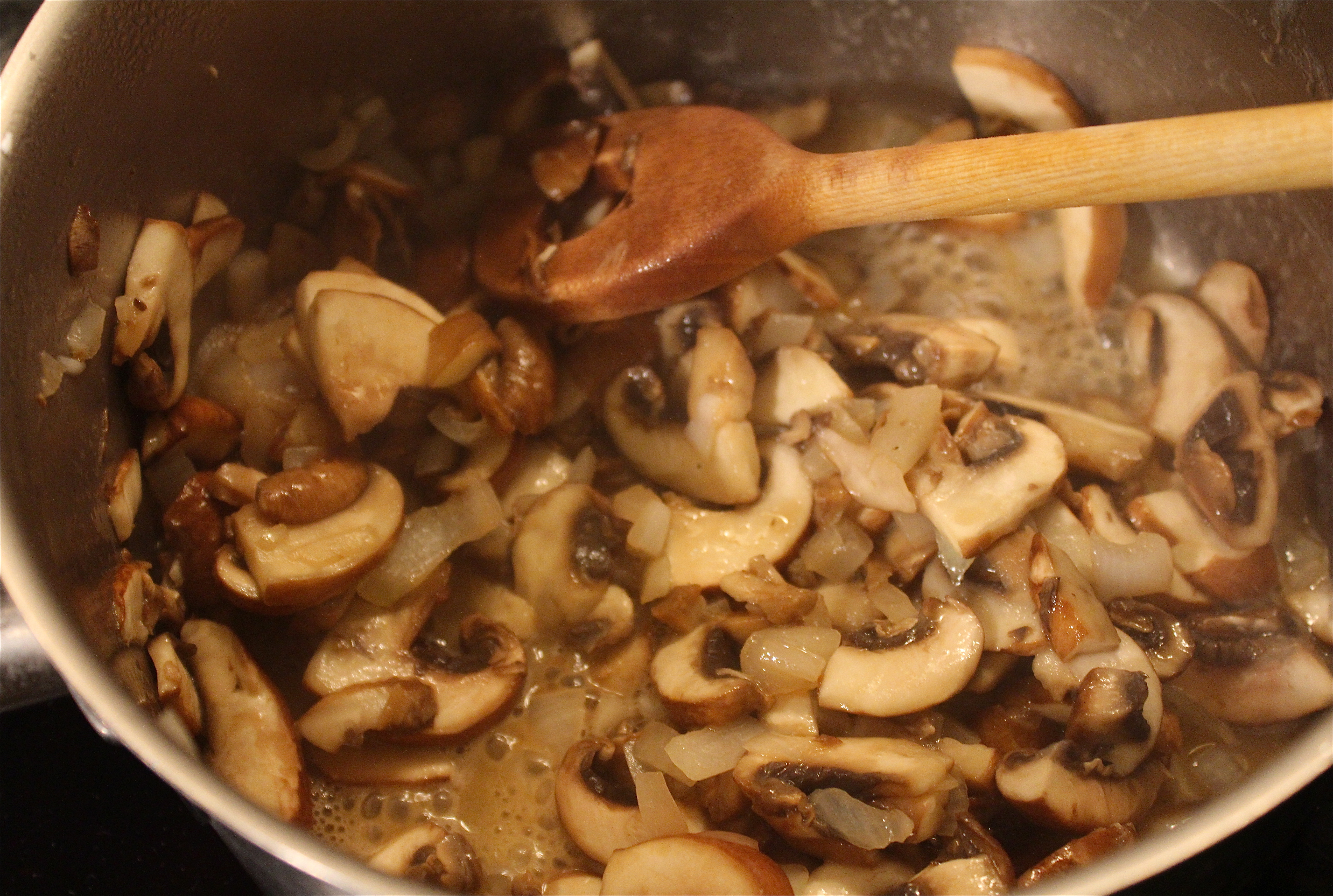Take a pot and heat up 2 of the 4 pieces of butter, add the onion, garlic and chopped mushrooms and cook them in the butter with 3 pinches of salt for about 7 minutes on a medium heat.