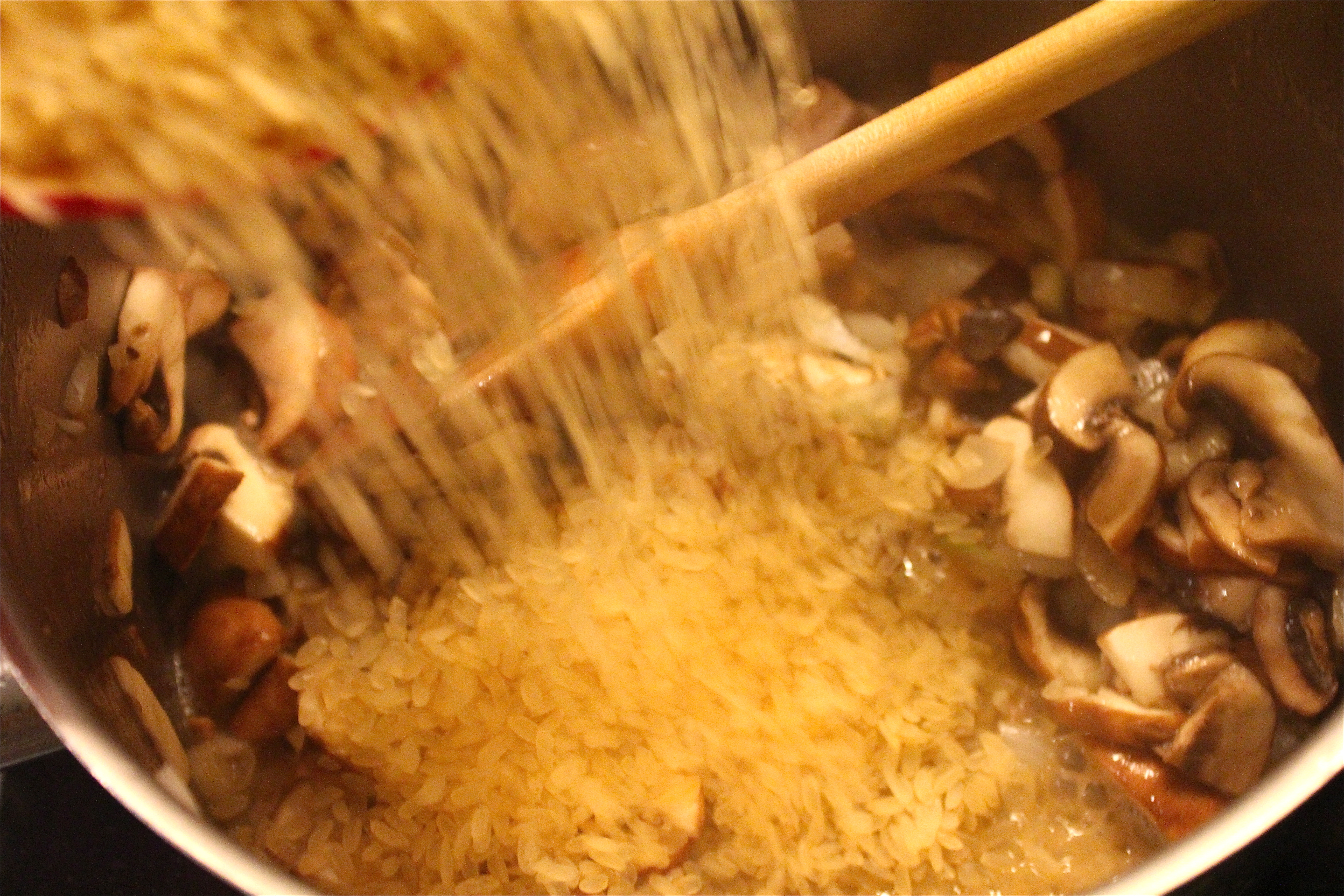 When the rice is ready and al dente and moist, take the pot off the heat and add the 2 butter pieces, then the parmesan to it by gently mixing it under, don’t stir it. Spice it to your taste. Put the lid on the pot and let it rest for a minute or two.