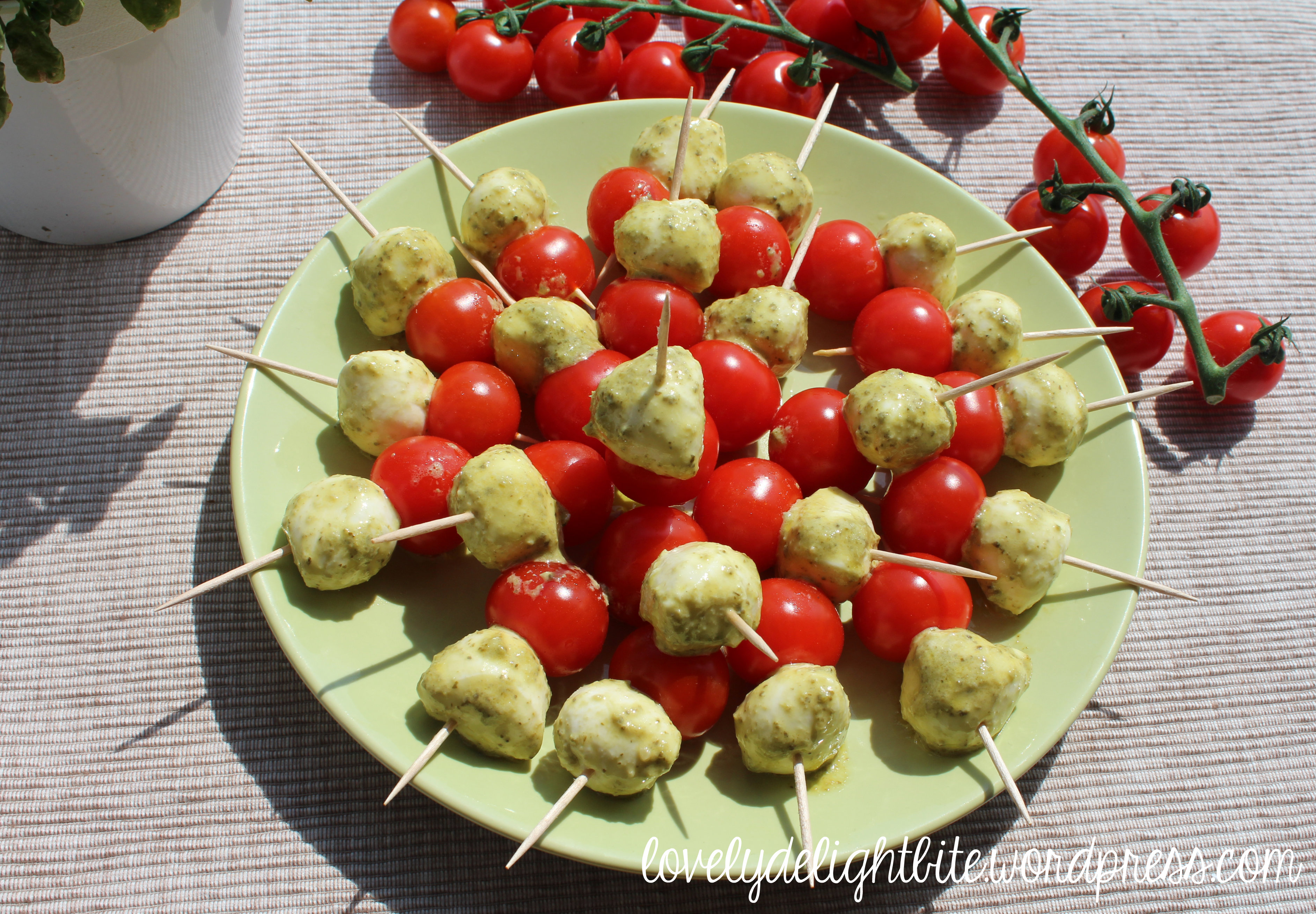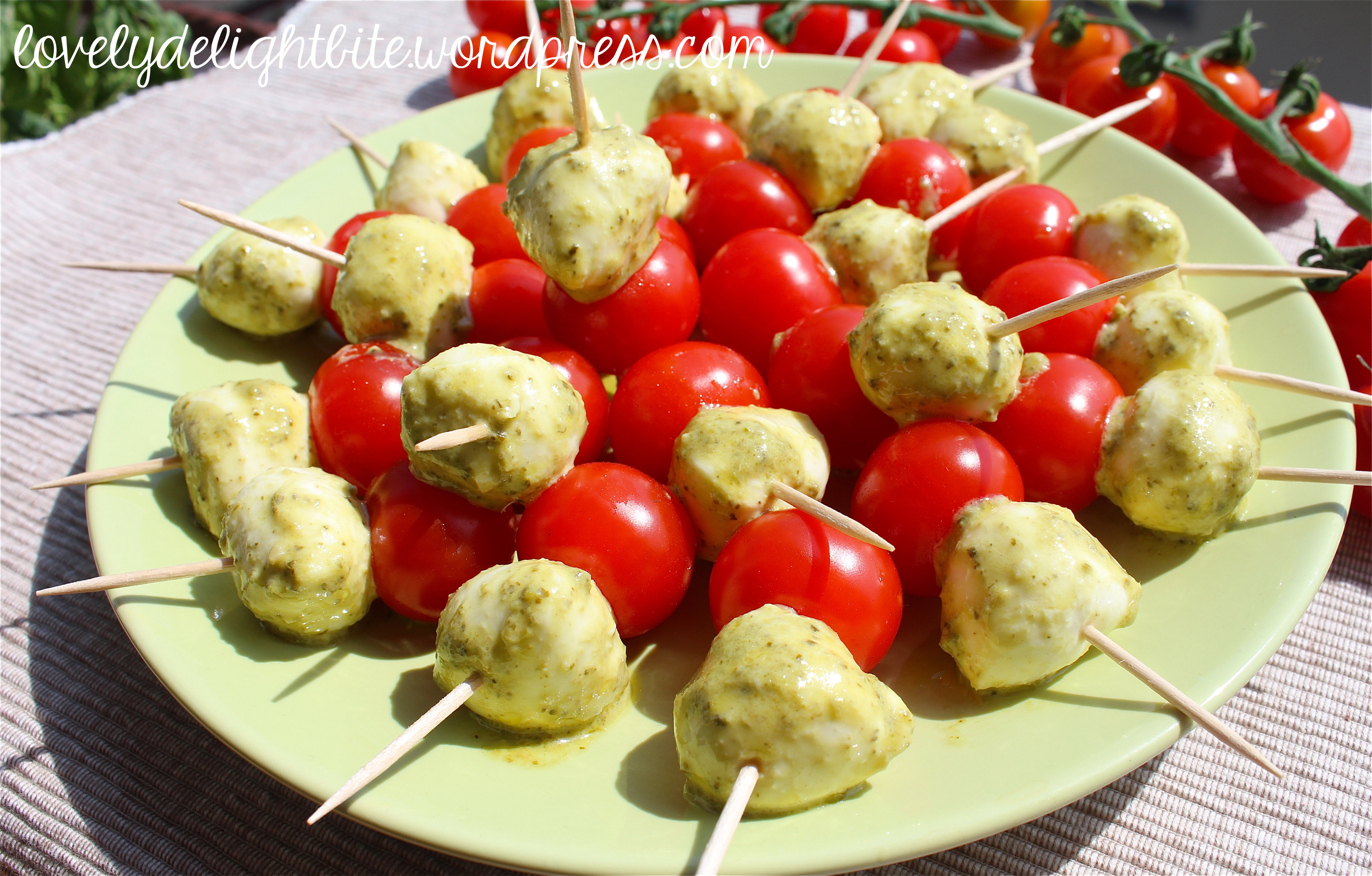 It’s sunny, it’s warm and it’s time to enjoy la bella vita! Here a simple but yummie Appetizer/Apéro idea: marinated Tomato-Mozzarella Skewers. Marinated with a paste of fresh Basil, Garlic, Olive Oil, Pepperoncini and Pine Nuts.