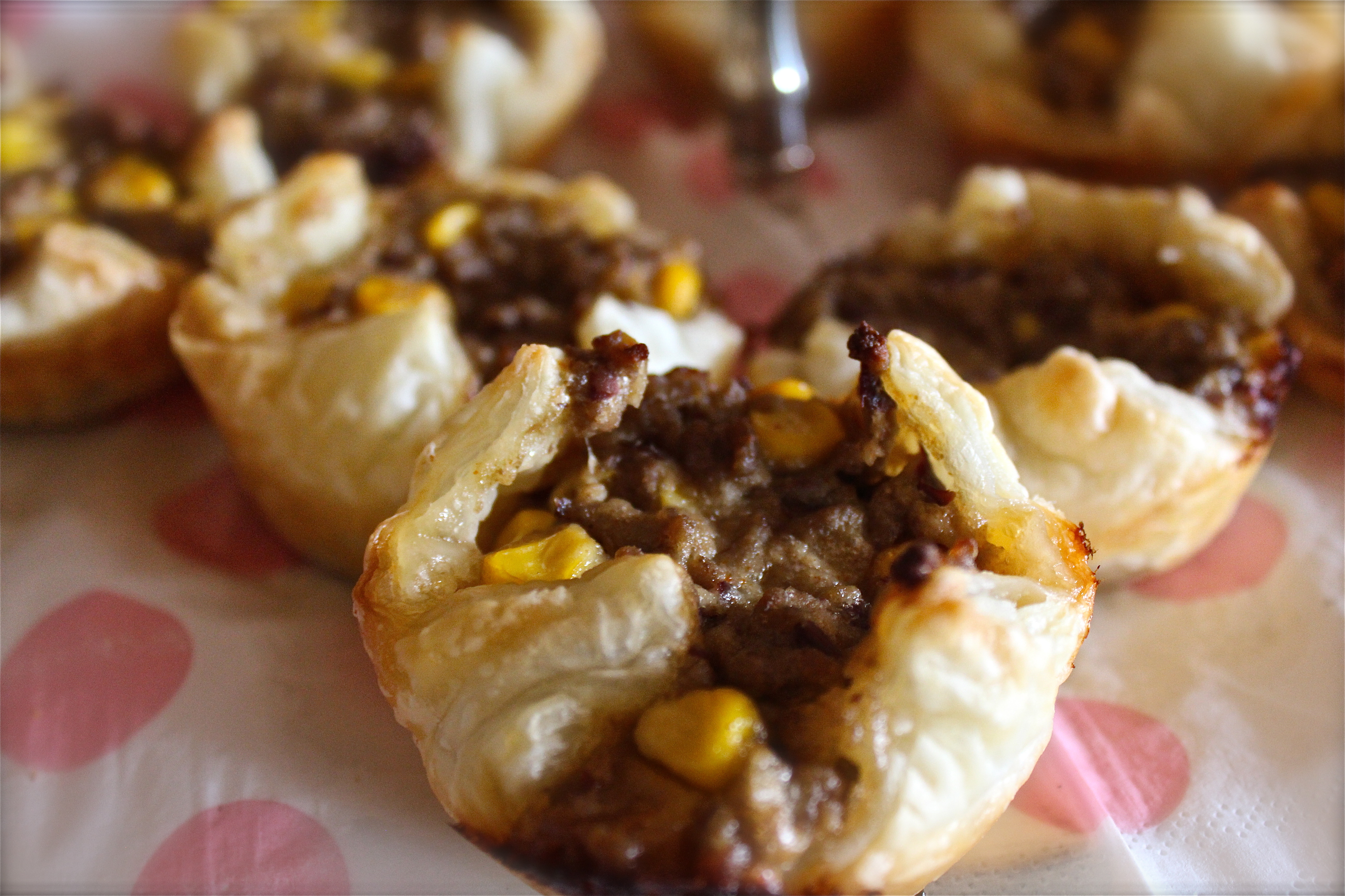 All you need to do is you butter a muffin form, cut scares from the dough and lay it out in the muffin form. Add the filling and fold the pastry endings into the center. Bake them for about 20 minutes by 200C/400F.